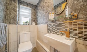 Upon entering, you are greeted by a spacious entrance hallway leading to a guest cloakroom. The heart of the home is the stunning open plan kitchen/dining & family room, complete with bifold doors that open out to the rear garden, perfect for indoor-outdoor living. The large living room features a charming fireplace, creating a cosy ambience.