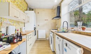 Range of fitted wall and base units with contrasting work surfaces, sink and drainer, integral electric oven, gas hob and extractor, tiled splashbacks, space for fridge freezer, plumbed for washing machine, window, panel radiator.