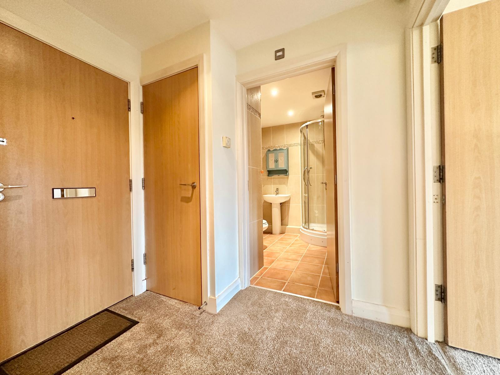 Accessed via an intercom entry system, the accommodation briefly comprises an inviting entrance hall with a useful storage cupboard, leading to a bright bay-fronted living room that flows semi-open plan into a stylish breakfast kitchen. The kitchen is fitted with an excellent range of wall and base units, along with integrated appliances including an oven, hob, and fridge/freezer. The main bedroom features built-in wardrobes and a fully tiled en-suite bathroom, while the second double bedroom is served by a modern, fully tiled shower room.