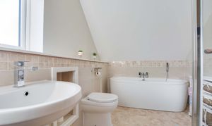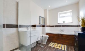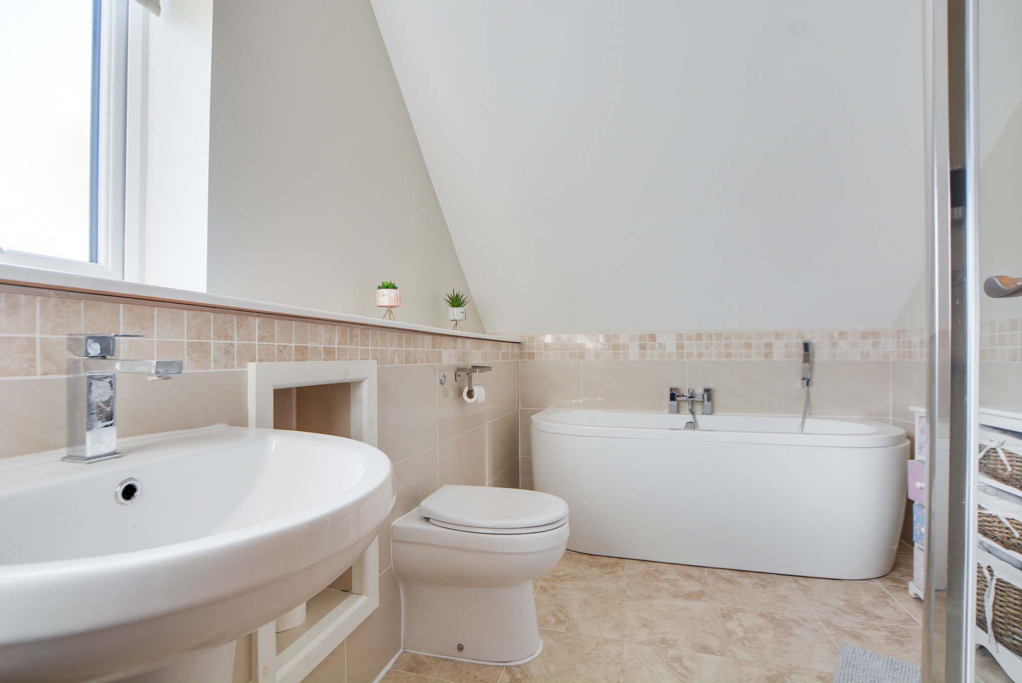The en-suite features a double-glazed side window, ceramic tiled flooring, bath, separate shower, low-level WC, wash hand basin, tiled splashbacks, spotlights, extractor fan and chrome towel radiator.