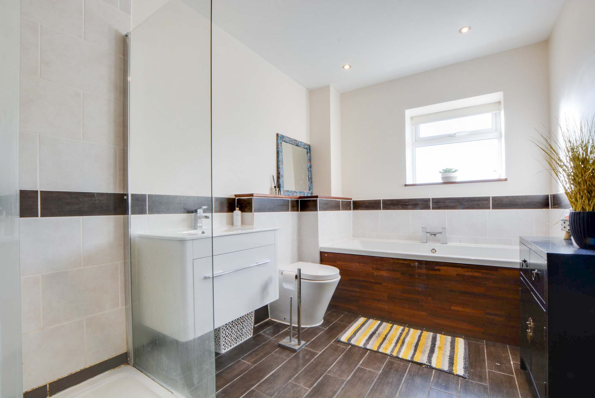 A spacious four-piece bathroom with a double-glazed window, ceramic tiled flooring, bath, separate shower cubicle, low-level WC, wash hand basin, spotlights, extractor fan and chrome towel radiator.