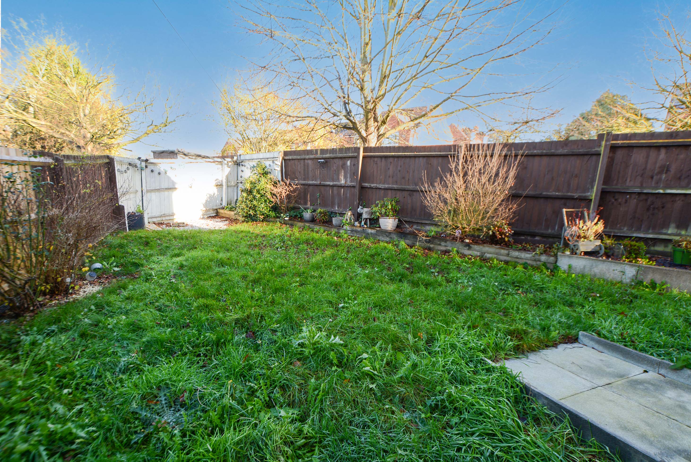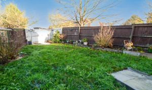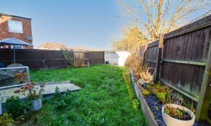Rear garden which is mainly laid to lawn, patio area, fence perimeter borders.