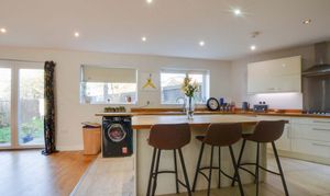 This generous open-plan space feels bright and airy thanks to a double-glazed window to the front, two side windows and bi-folding doors opening out to the rear garden. Oak flooring with underfloor heating runs through the room, and there’s a cast-iron fuel-burning stove set on a tiled hearth. The space also includes a television point and spotlights. The lounge dining area is open to the kitchen.