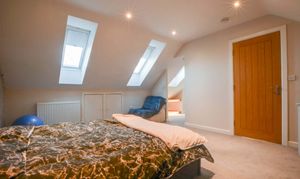 Positioned on the top floor, this spacious bedroom has two double-glazed skylight windows, spotlights, under-eaves storage, a television point and two radiators. An opening leads through to the dressing area.