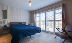 A rear-facing double-glazed window with feature shutters brings light into this room. It includes a wardrobe with shelving, a radiator and a door leading to the en-suite.