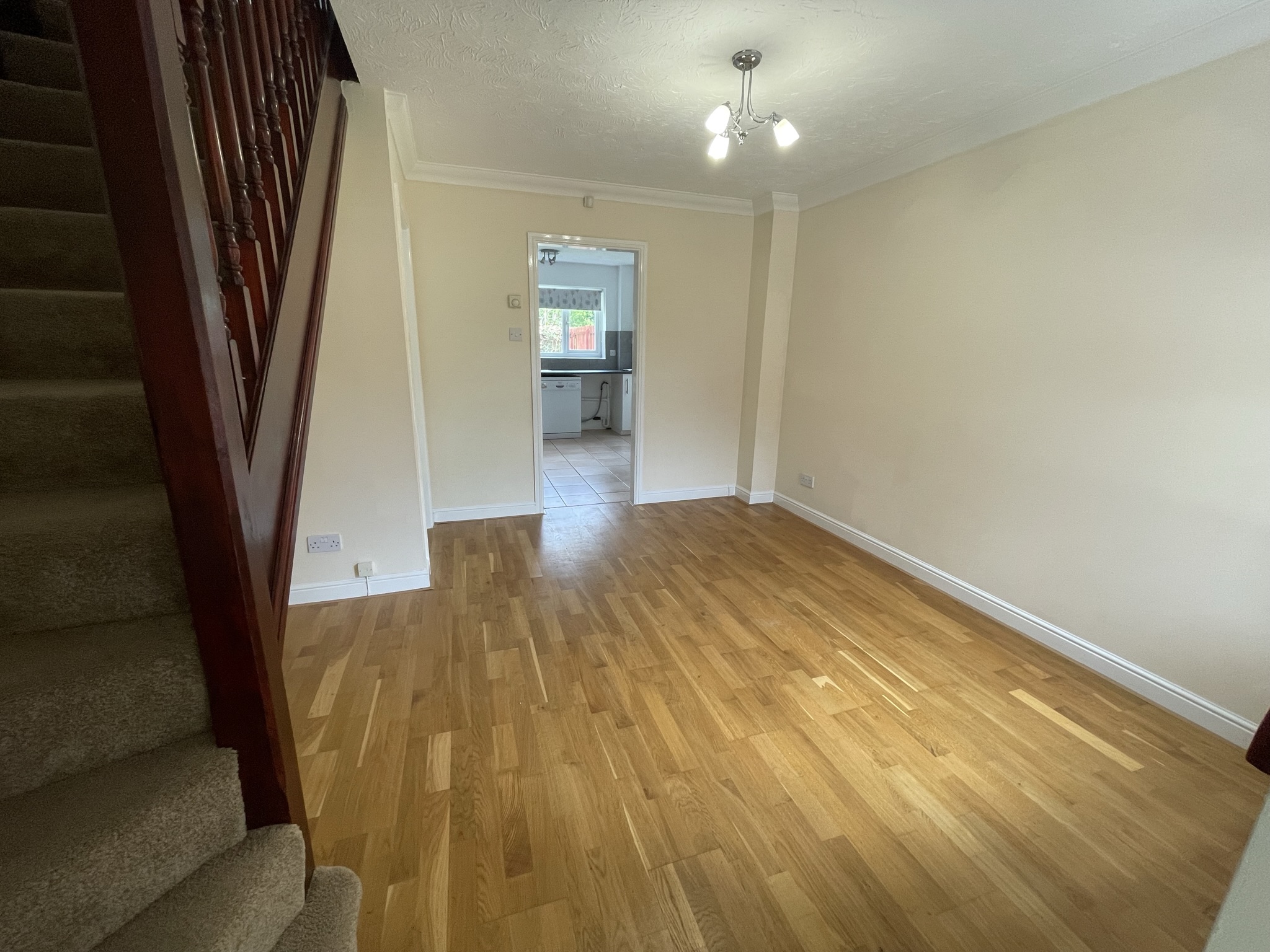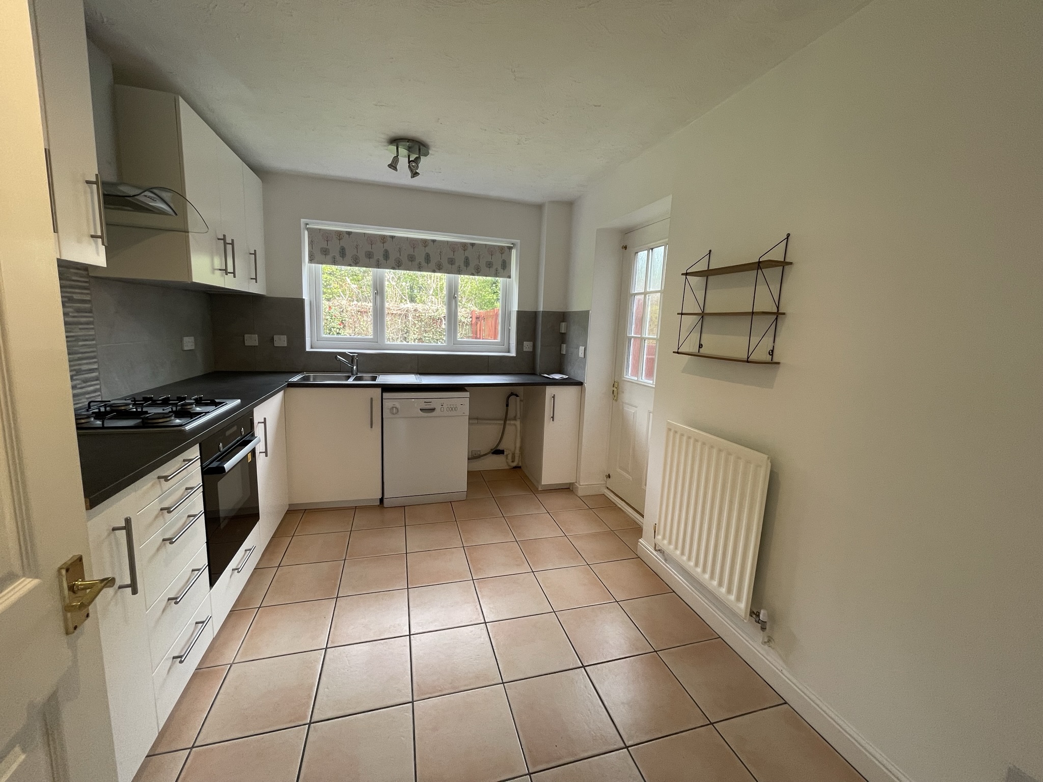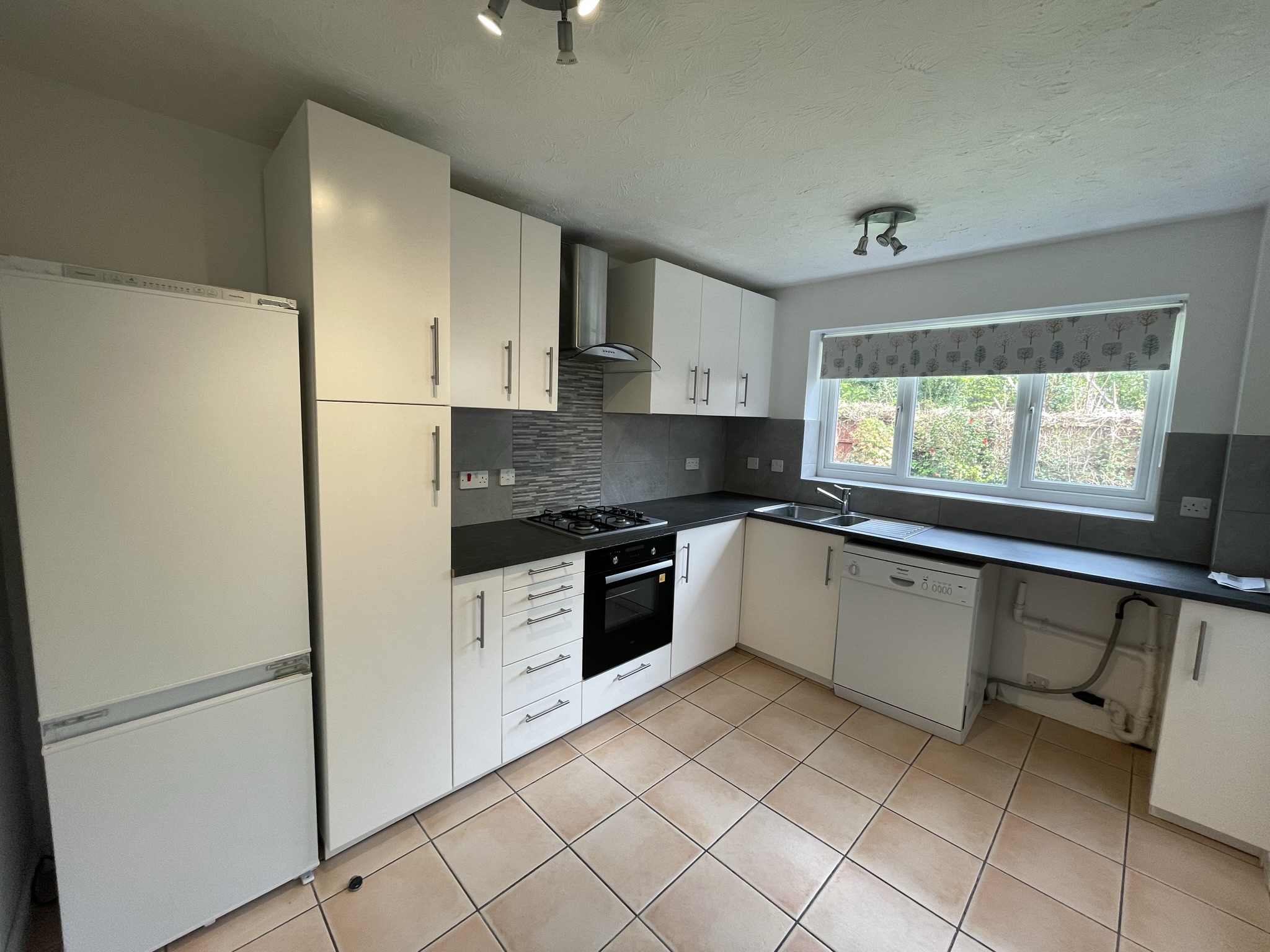 Fitted kitchen, complete with integrated hob, oven, fridge freezer and extractor. Free standing washing machine. Window to the rear elevation.