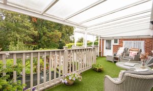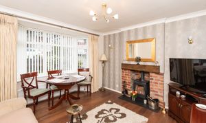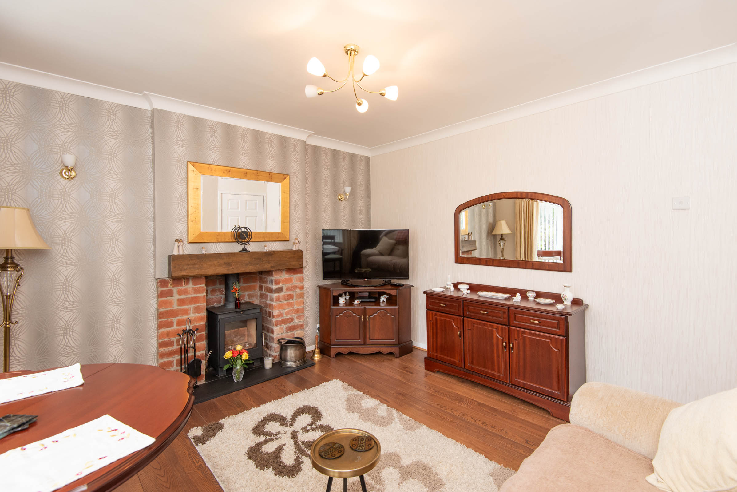 Upon entering, you are greeted by the spacious bay window living room featuring a cosy log-burning stove, perfect for relaxing evenings. The dual-aspect lounge with patio doors to the garden infuses the space with natural light, creating a seamless indoor-outdoor living experience.
