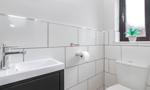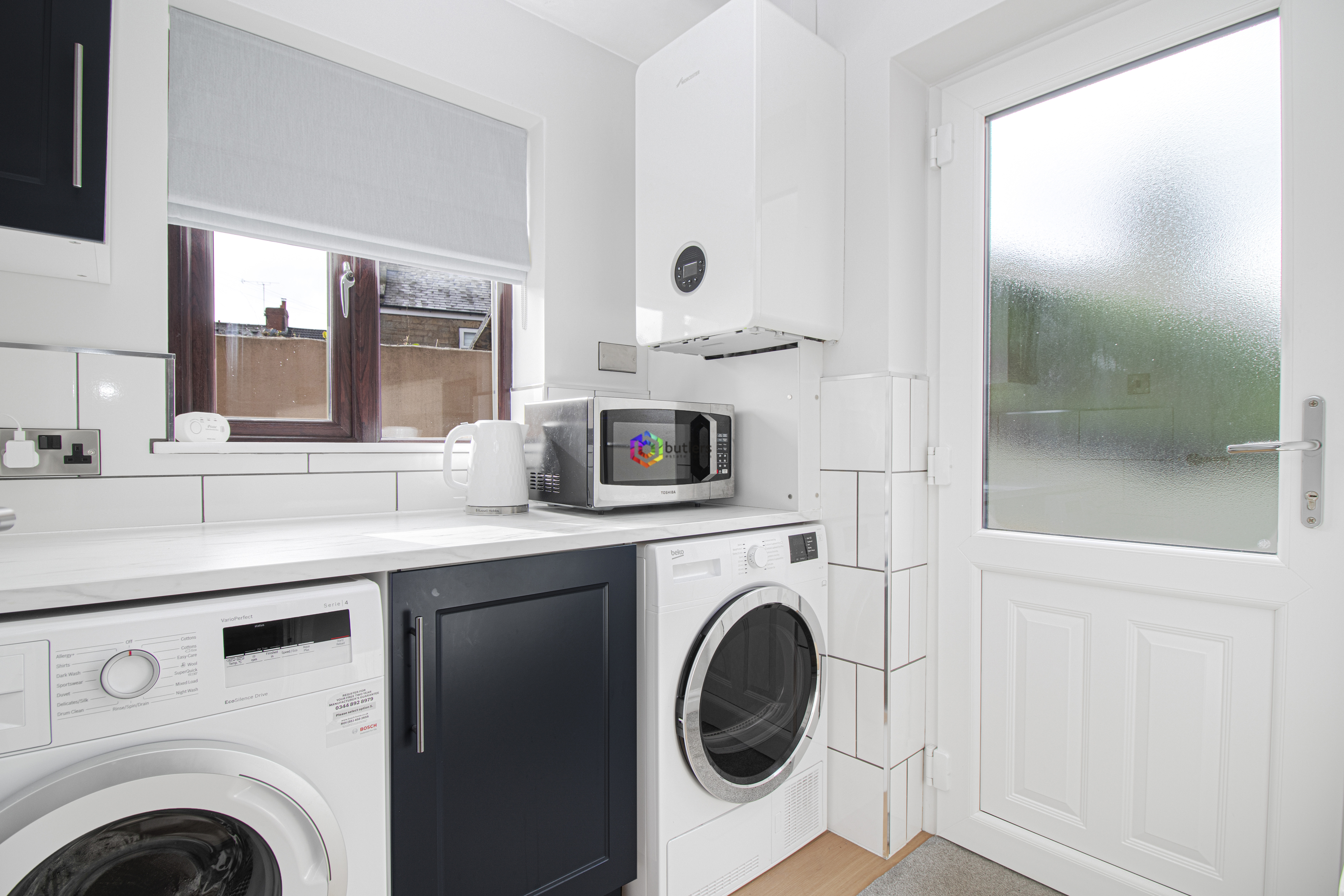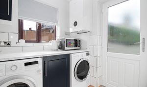Again recently refurbished with space for both a washing machine and dryer, the new wall mounted boiler is next to the window looking out to the side of the house.