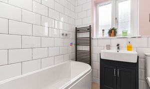 Modernised bathroom with a lovely white bath , square white wash hand basin on a vanity unit and a white WC. There is a window to the rear.