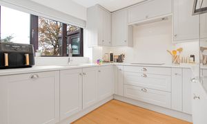 Superb recently renovated kitchen with an eye-level single electric oven, induction hob with extractor over, free-standing fridge/ freezer and integrated dishwasher. The modern inset double bowl sink, with quooker hot tap, is located beneath the window overlooking the rear garden. The room has made the best use of space and provides those who enjoy cooking to have everything within reach.