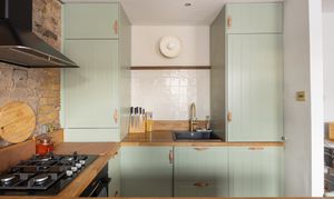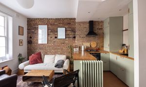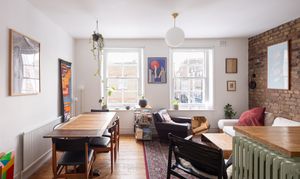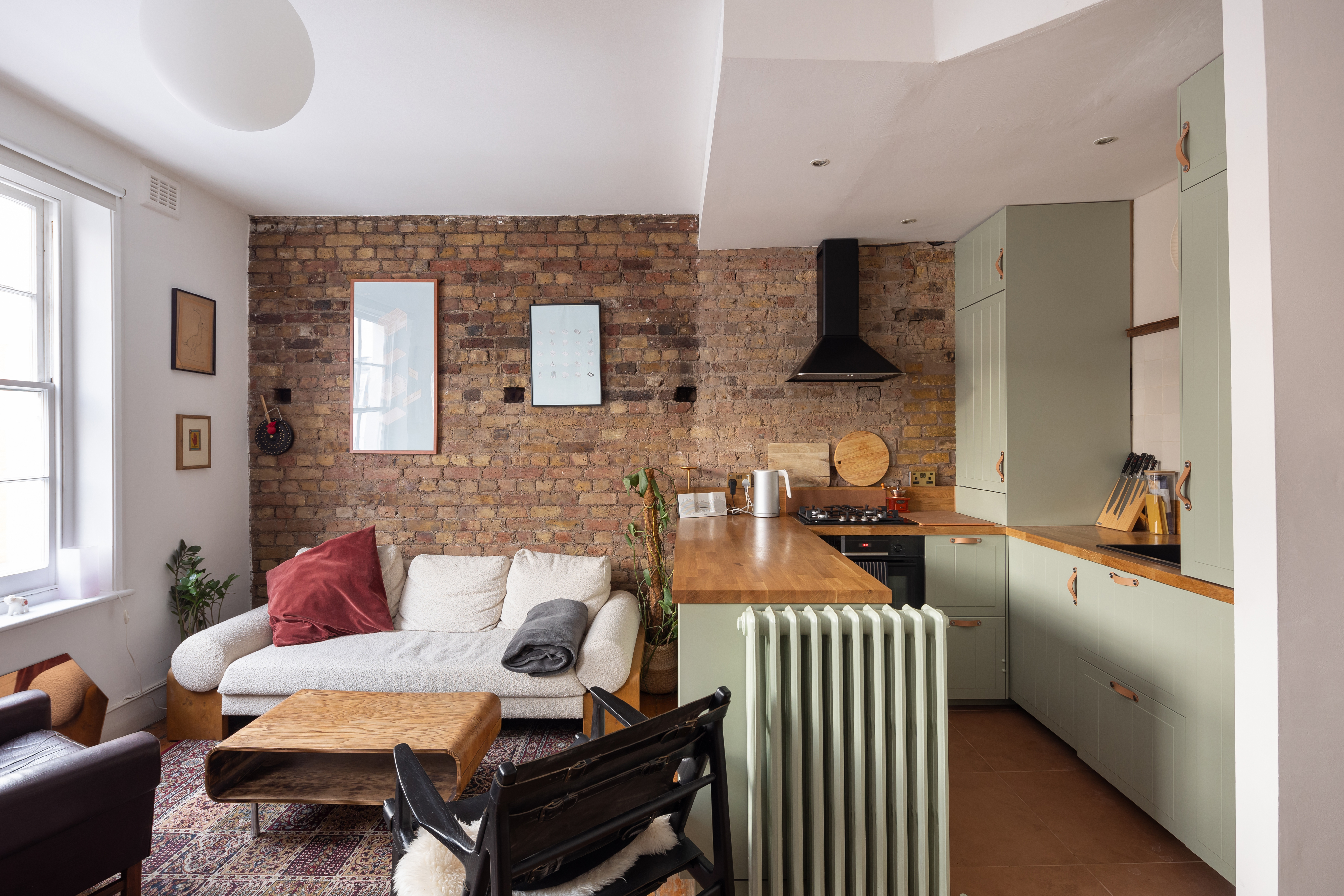 The apartment features an open-plan living space that has been designed to combine style and functionality. The exposed floorboards and brickwork bring a sense of warmth and authenticity to the room, evoking the charm of its period setting. The large windows on the south-western side of the apartment flood the space with natural light, creating a bright and welcoming ambience throughout the day.