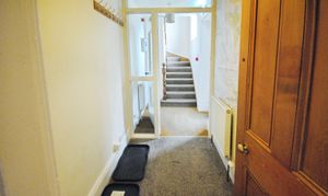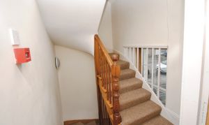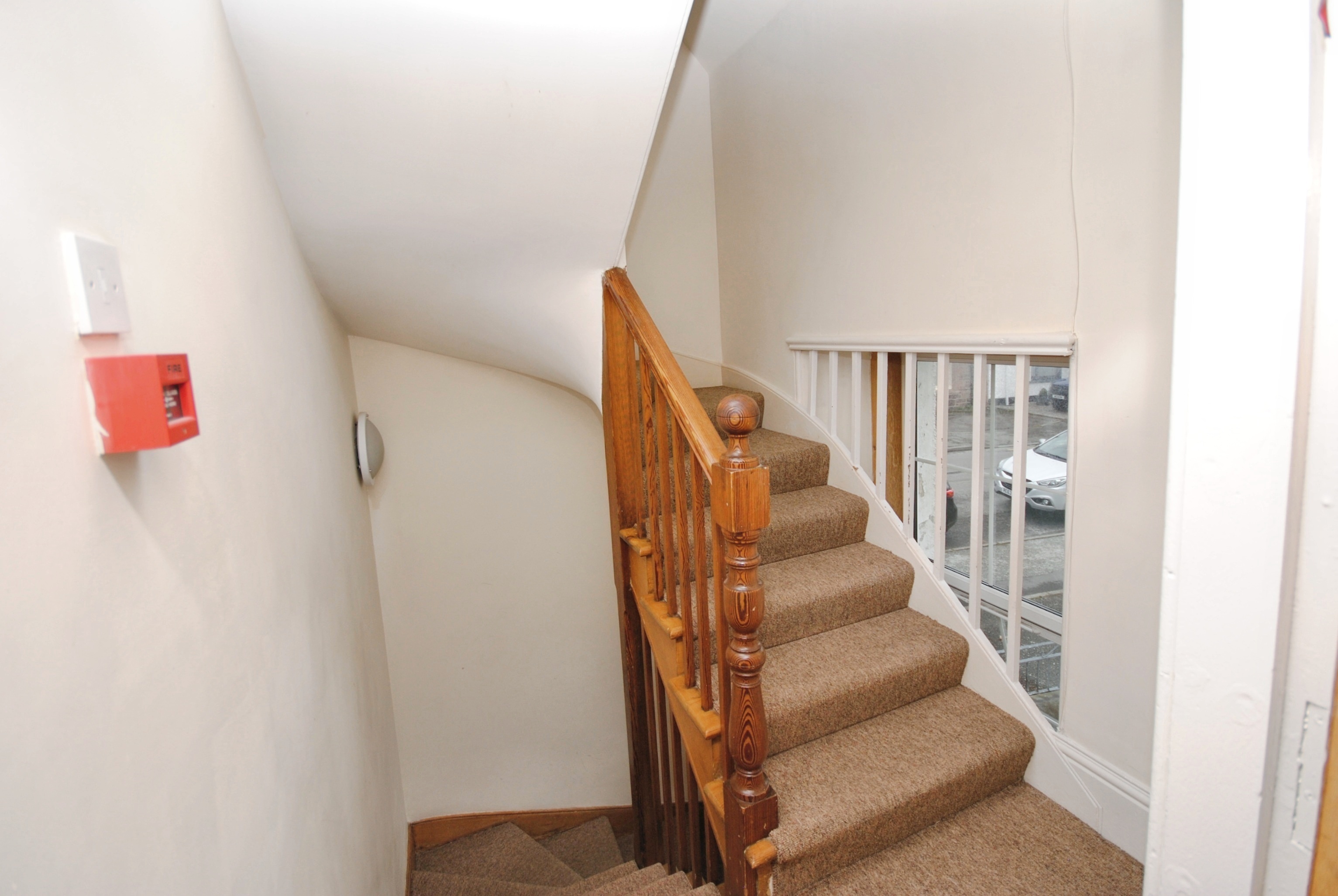 A fire door provides access to the L-shaped hallway on the first floor, which features a window overlooking the garden area adjacent to West Argyle Street.