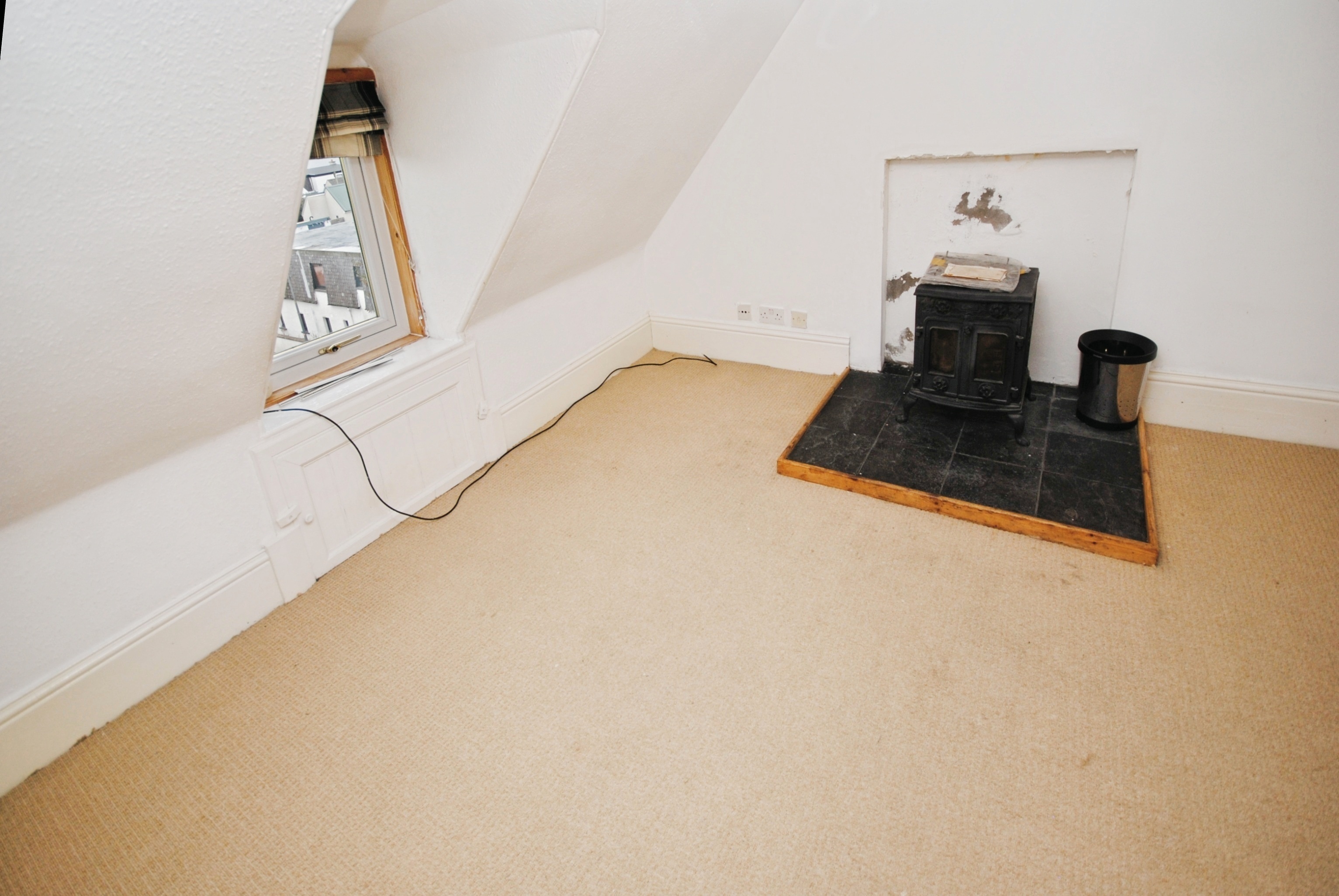 This double bedroom has also served as a cosy retreat. It features a stove positioned on a tiled hearth and a window that provides a view overlooking Ullapool and the surrounding scenery.