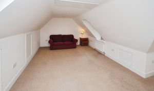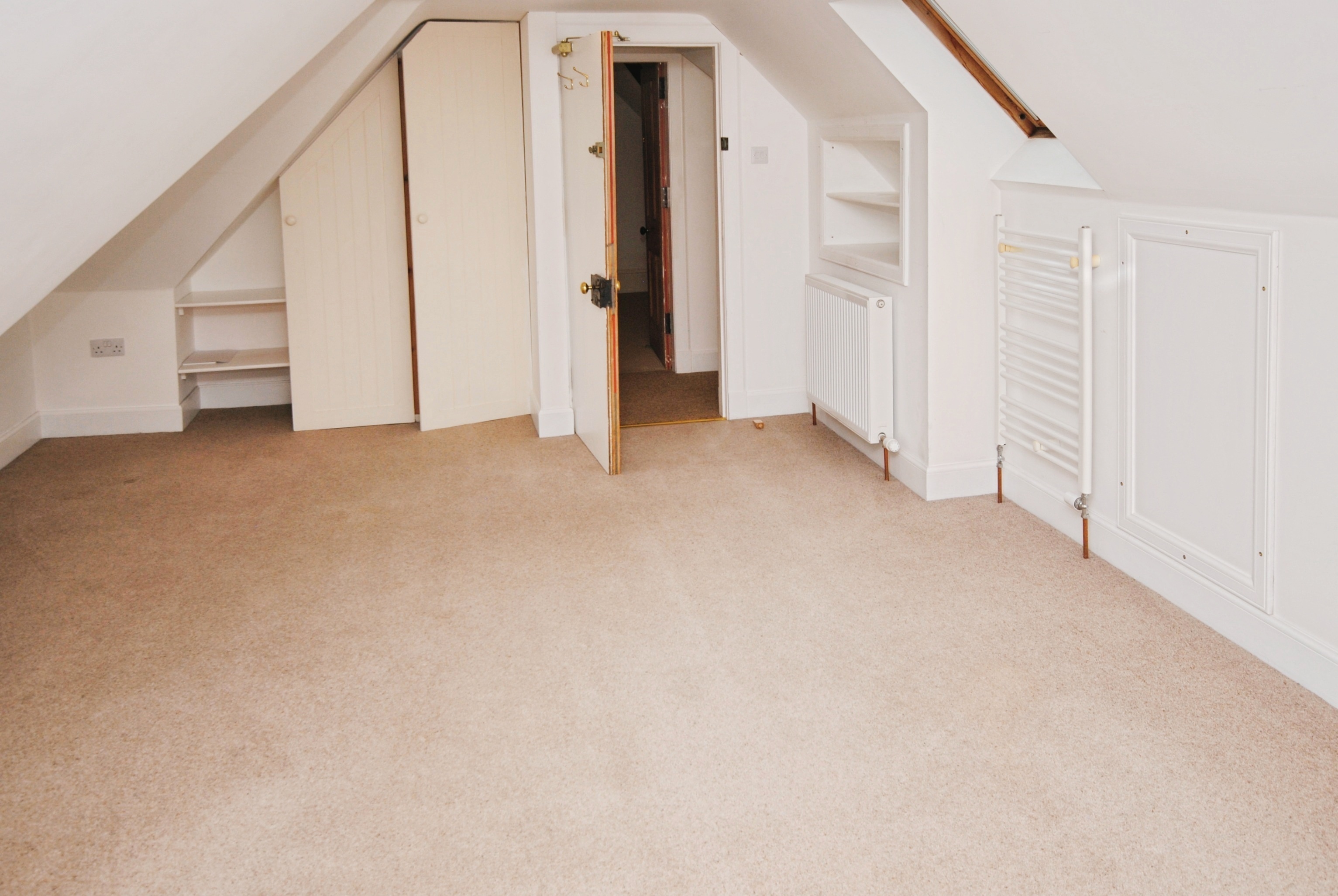 A staircase ascends from the landing on the first floor to the attic living area, which features coombed ceilings, Velux-style window, and provides access to eaves storage.