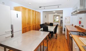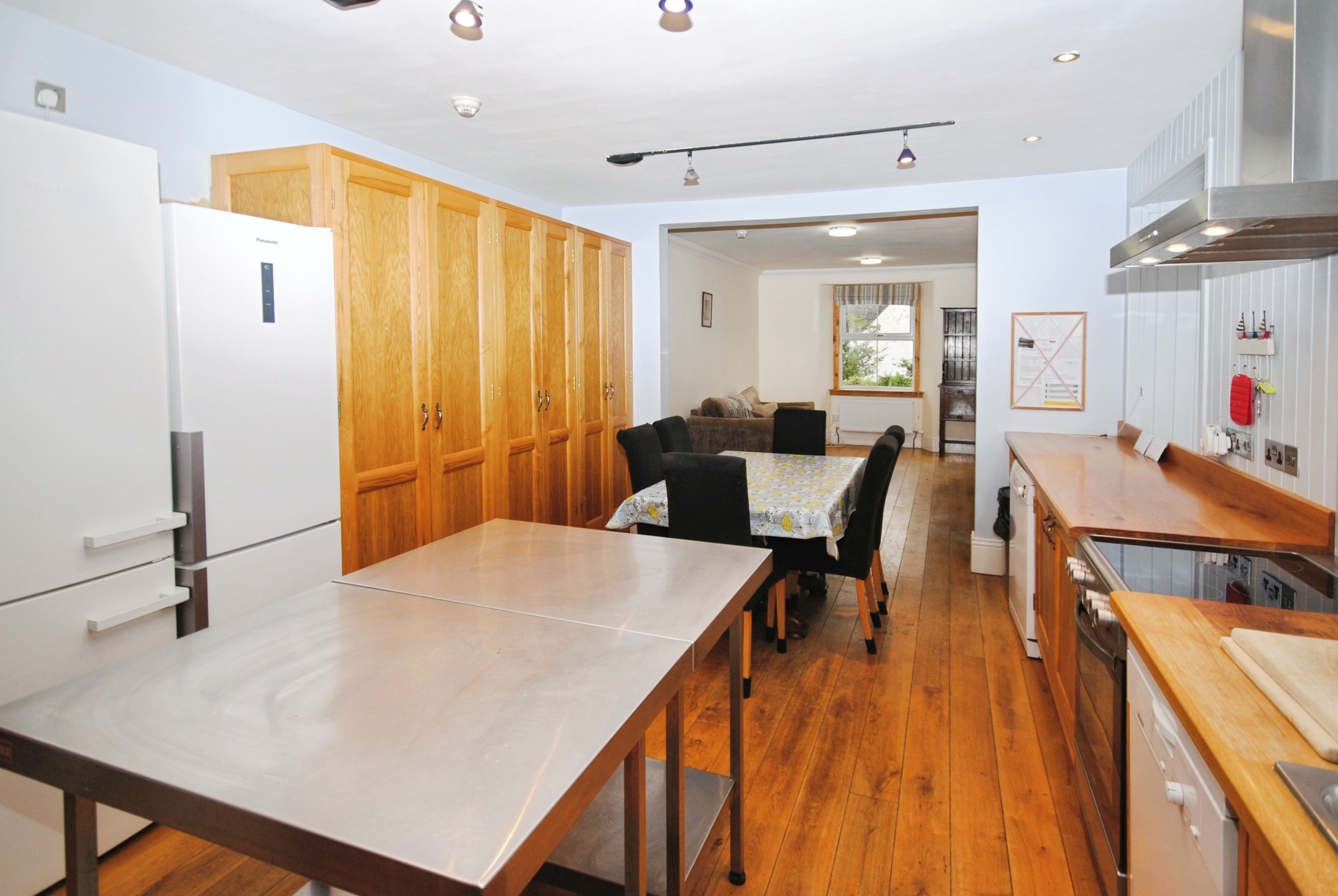 The expansive kitchen is designed for stylish catering. At its centre, a three-oven, two-hot-plate electric Aga (featuring AIMS control) serves as both a functional element and a source of warmth, encircled by bespoke fitted oak and ash cabinetry, worktops, and three full-height double larder cupboards. Additionally, the kitchen is equipped with a double-sized stainless steel sink complete with a mixer tap. A tiled splash back and an oak shelf are positioned behind the Aga, while the walls above the wooden worktop risers are adorned with painted wood paneling. Two windows on the side of the kitchen offer views past the Ceilidh Place over the loch towards the hills, complemented by a third window facing West Argyle Street.