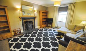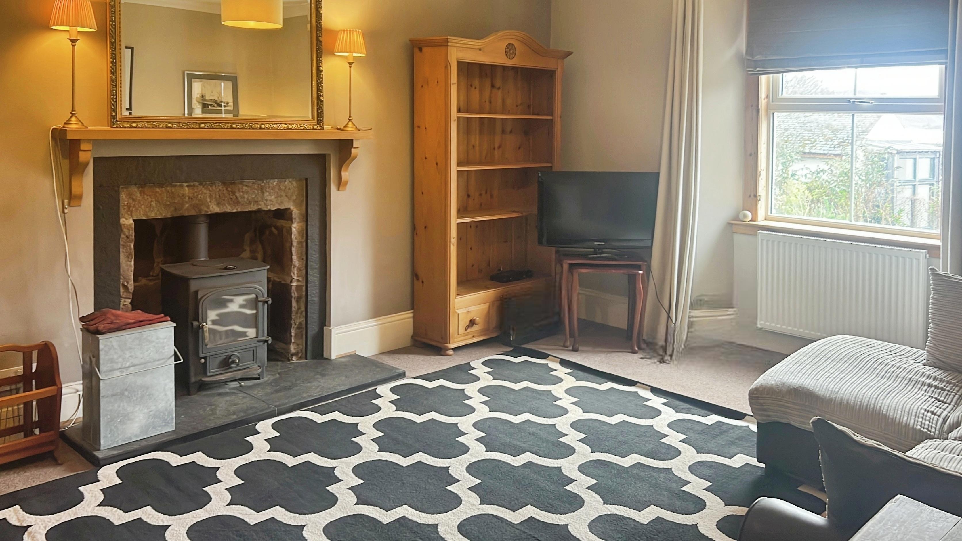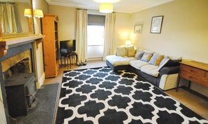 The spacious and elegantly appointed lounge features a window at the rear of the property, offering views over West Shore Street to Loch Broom. A high-output multi-fuel stove sits on a traditional stone fireplace with a Caithness stone hearth and surround, complemented by an oak mantle.