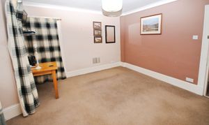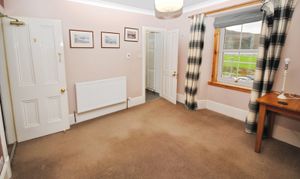 This expansive bedroom features a window overlooking the rear of the property, offering views of the head of Loch Broom and the surrounding hills. Additionally, the room is equipped with a wash basin and an en-suite bathroom.