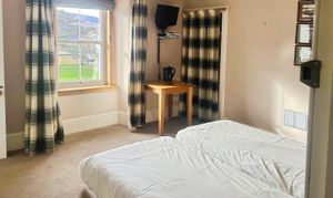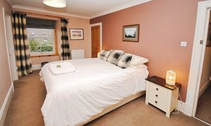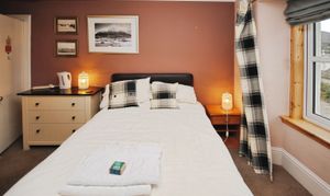 This spacious bedroom features a side window that offers views of Loch Broom and the surrounding hills, as well as a curtained wardrobe. En-suite shower room.
