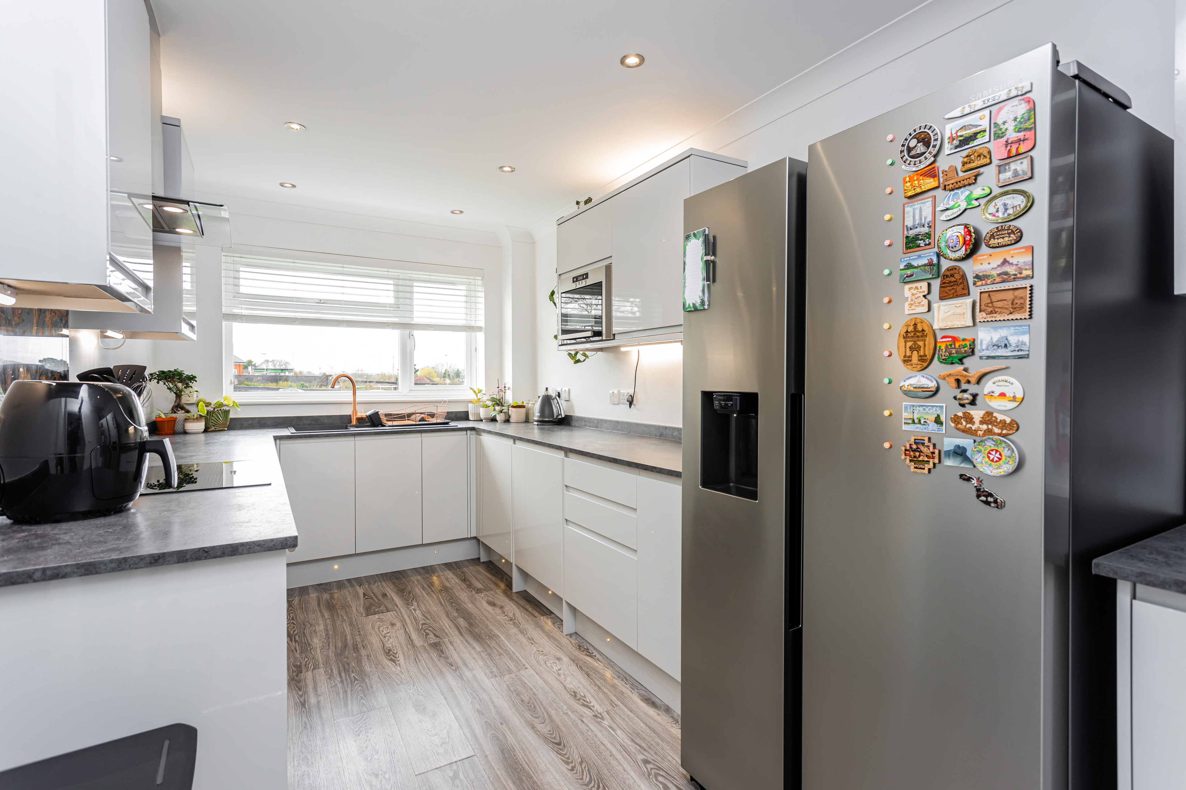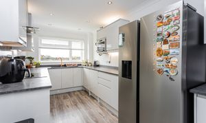 The separate kitchen has been thoughtfully updated, featuring a range of modern wall and base units, granite-effect worktops, an upgraded sink, laminate flooring, illuminated kickboards, and ceiling spotlights. Integrated appliances include an oven with electric hob, dishwasher, washing machine and a microwave.