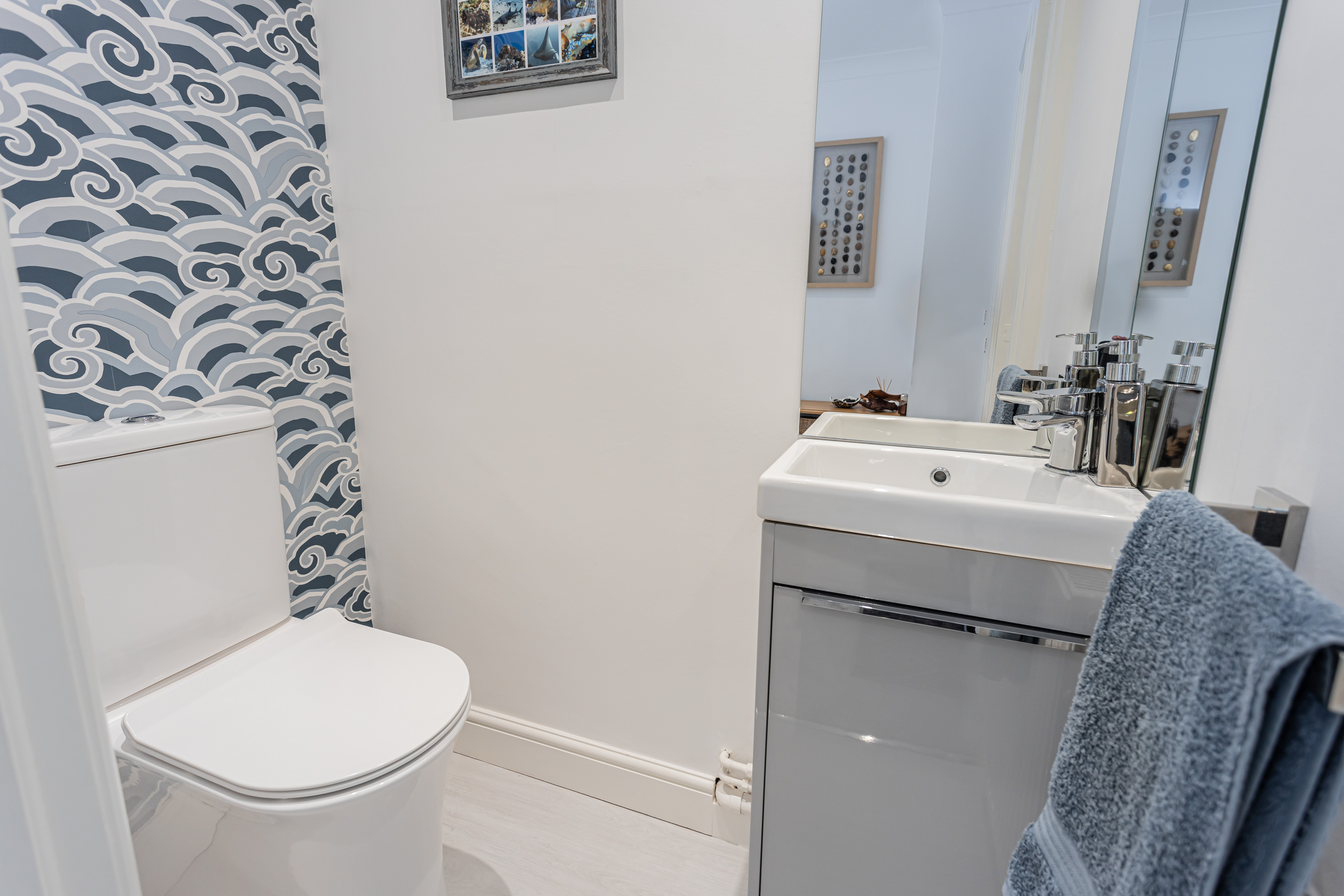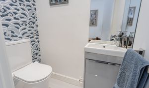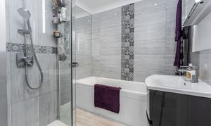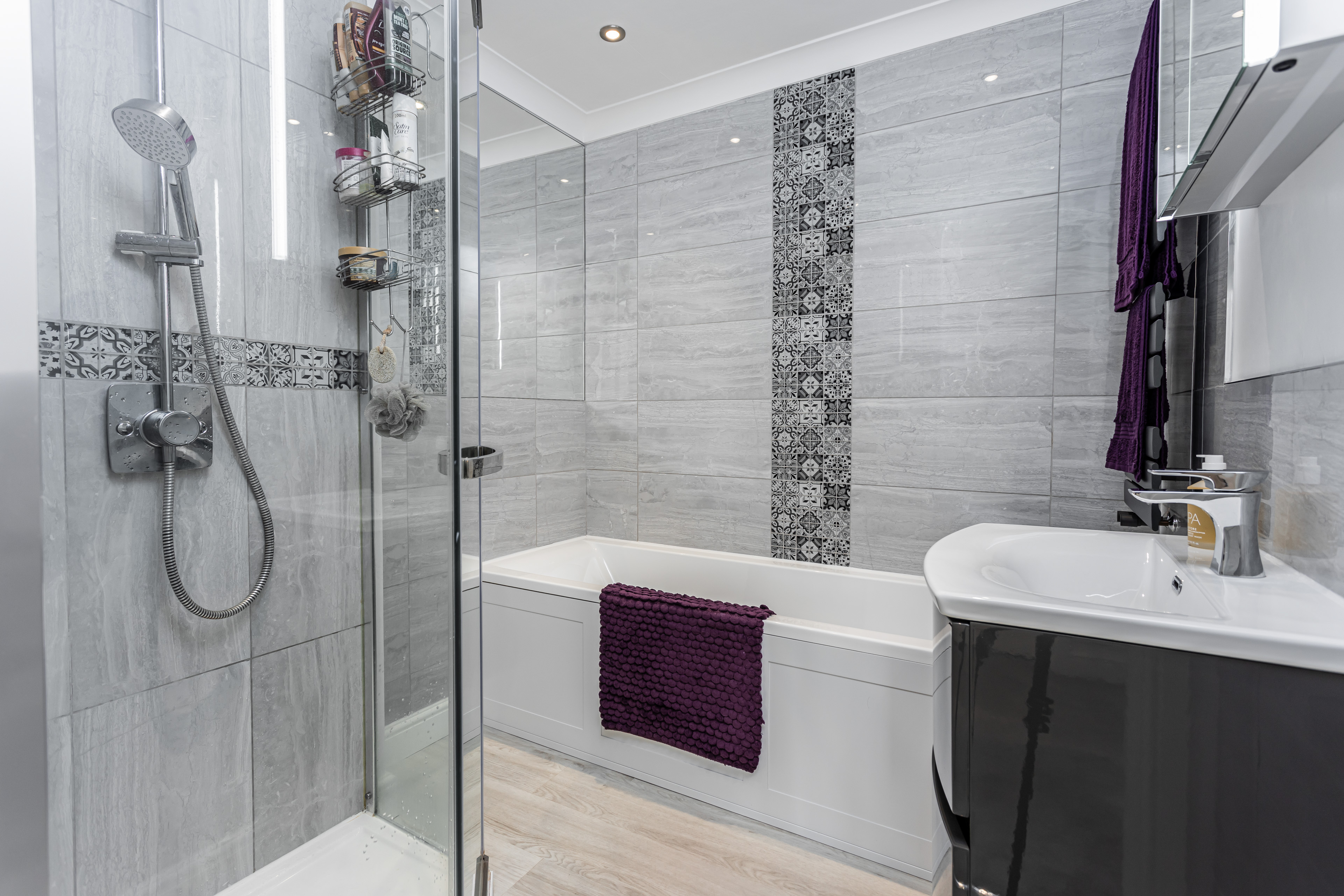 The bathroom has also been stylishly refurbished and includes a bath, separate shower cubicle, and wash basin, complemented by fully tiled walls, laminate flooring, and spotlights. A separate WC adds further convenience.