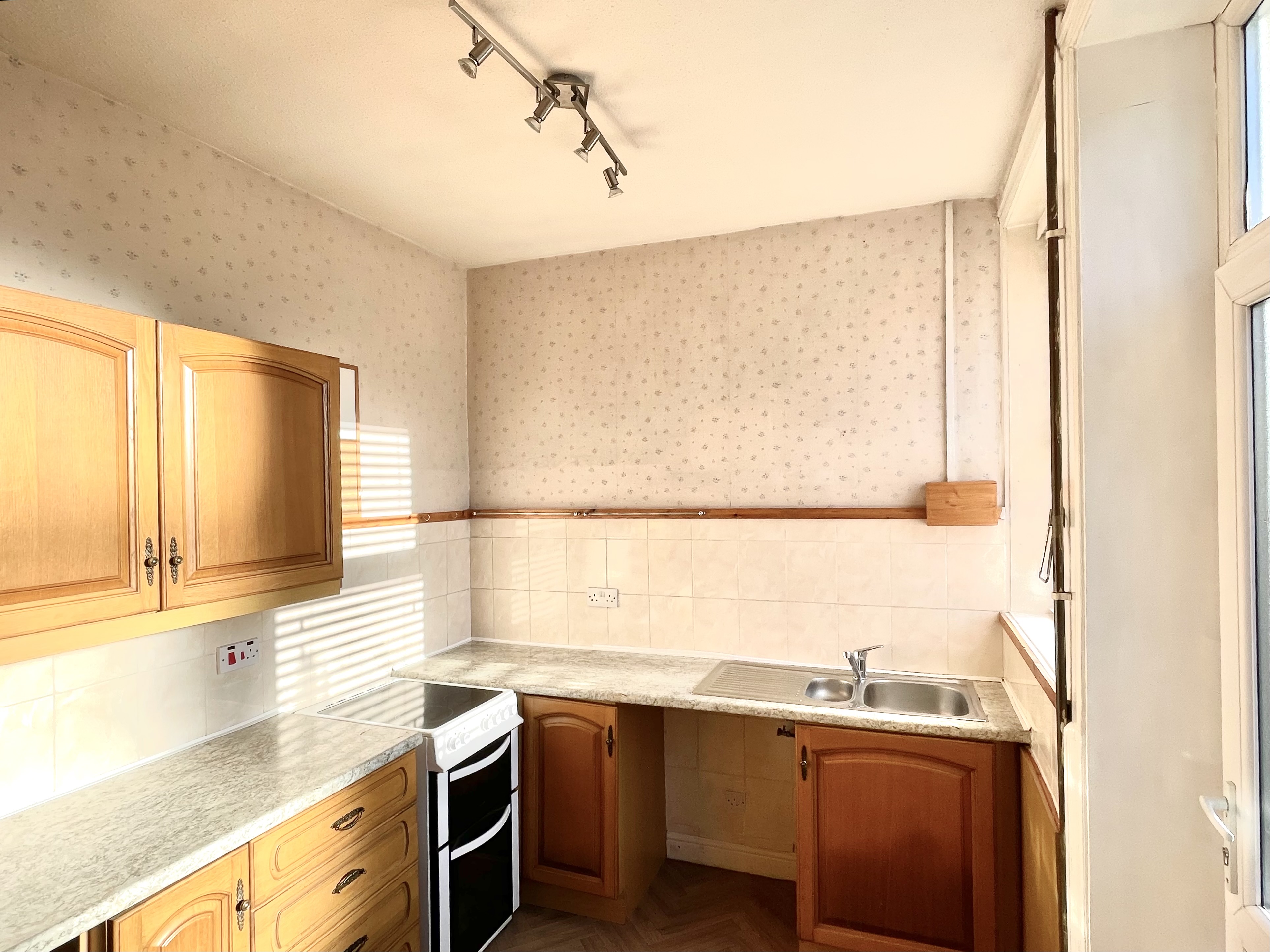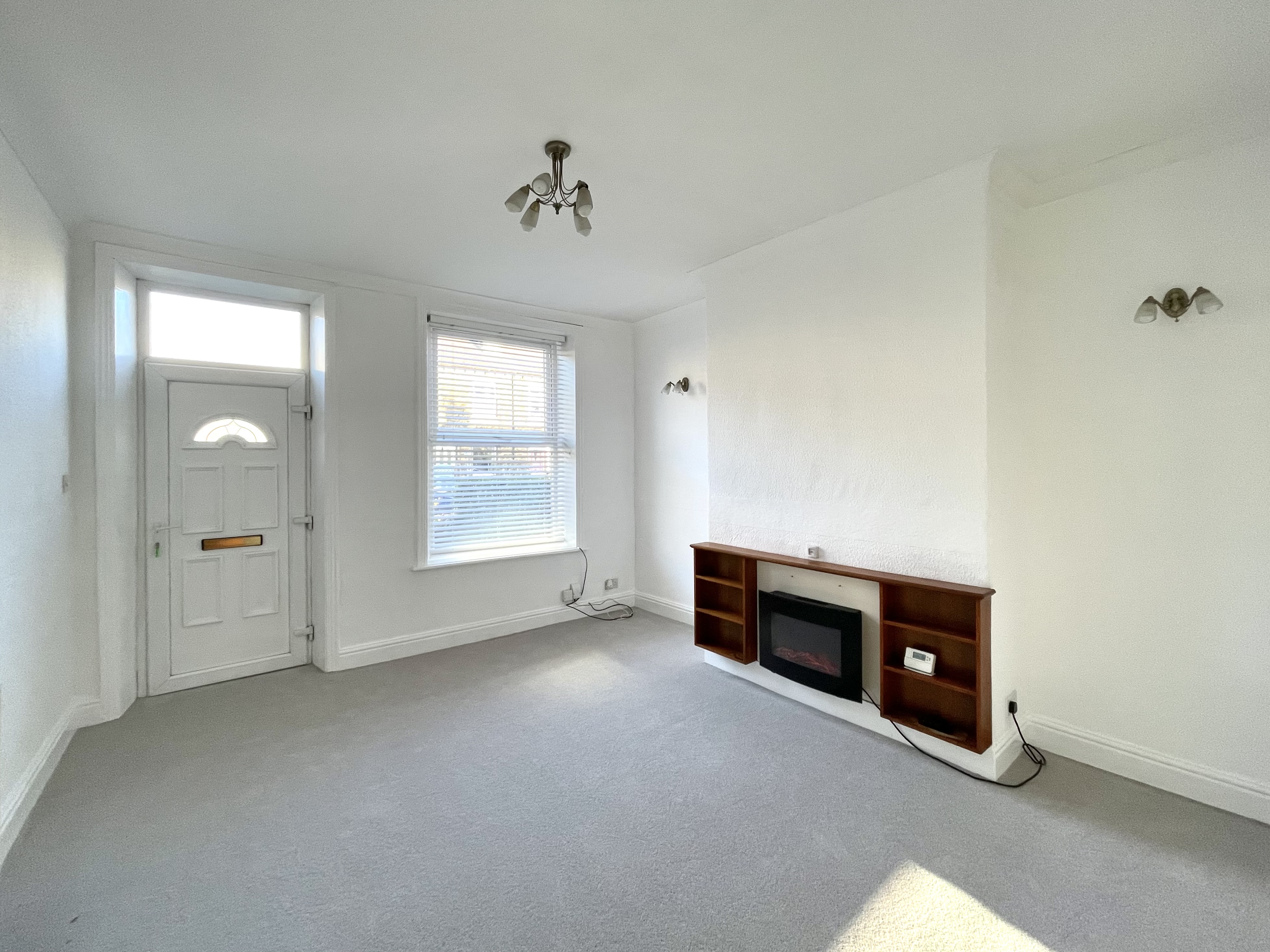 A well-proportioned reception room situated to the front of the house and looking out over the garden, the decor is fresh and bright with plenty of natural light, new grey carpeting and there is a central heating radiator and as the main focal point of the room there is a wall mounted flame effect electric fire. From the living the door provides access to the kitchen.