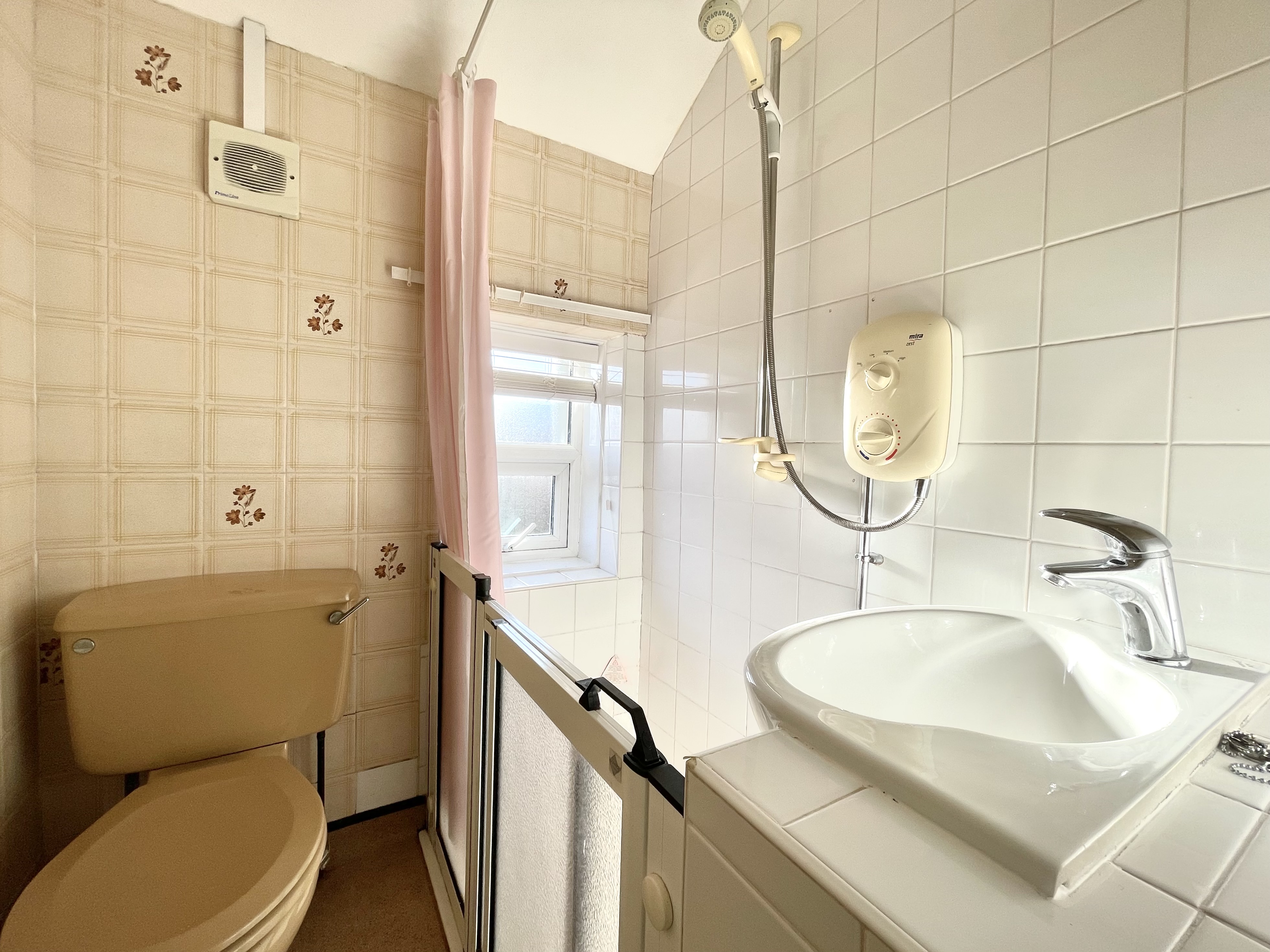With natural light from a frosted pvcu double glazed window and fitted with a suite comprising hand wash basin, low flush WC, shower cubicle with Mira electric shower fitting, majority tiled walls, extractor fan and radiator.