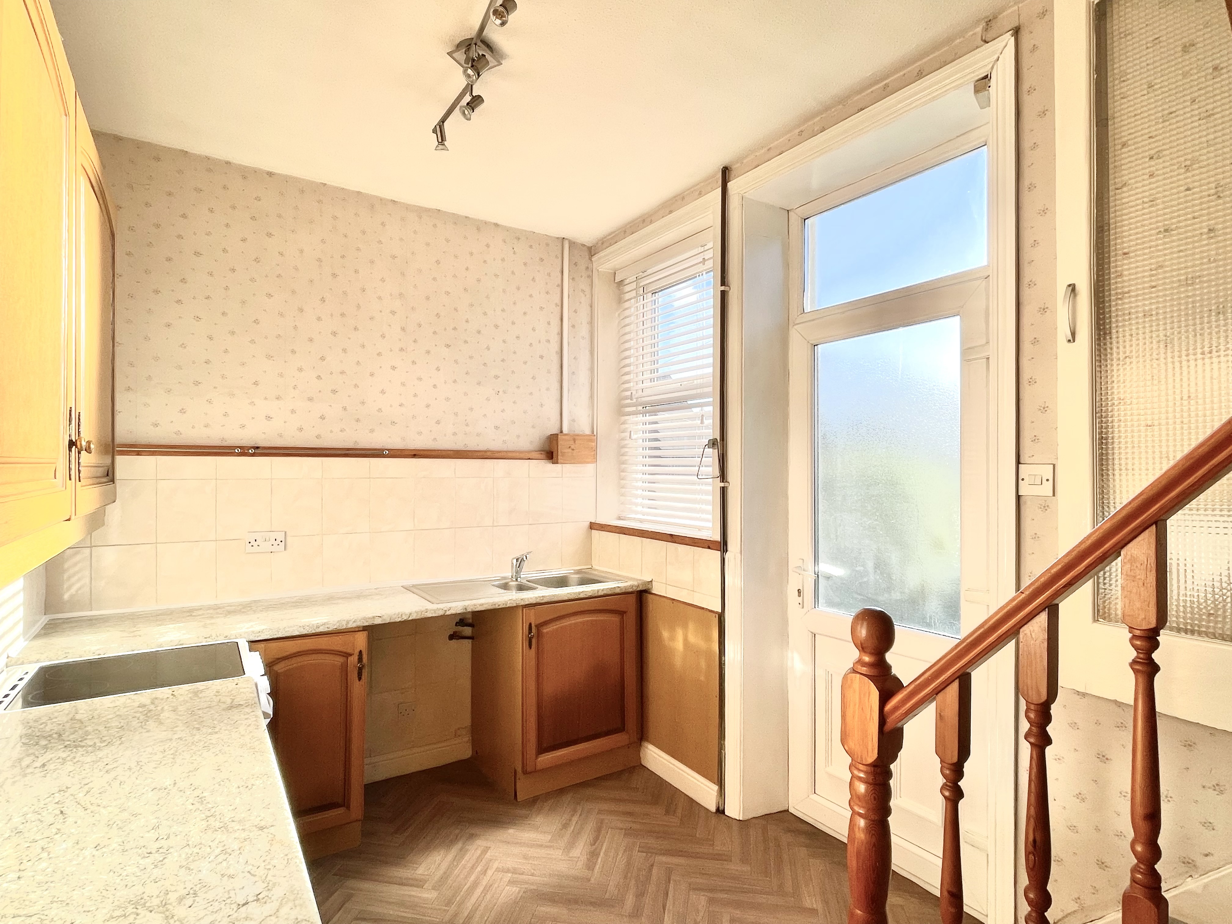 The kitchen is well supplied with a range of fitted base and wall cupboards, contrasting overlying worktops and tiled splashbacks, fitted stainless steel sink, electric cooker point and plumbing for automatic washing machine. There is a central heating radiator and trap door which gives access to the cellar providing useful additional storage space. There is an exterior door which gives access to the south easterly facing patio and rear garden whilst an interior door gives access to the first floor.