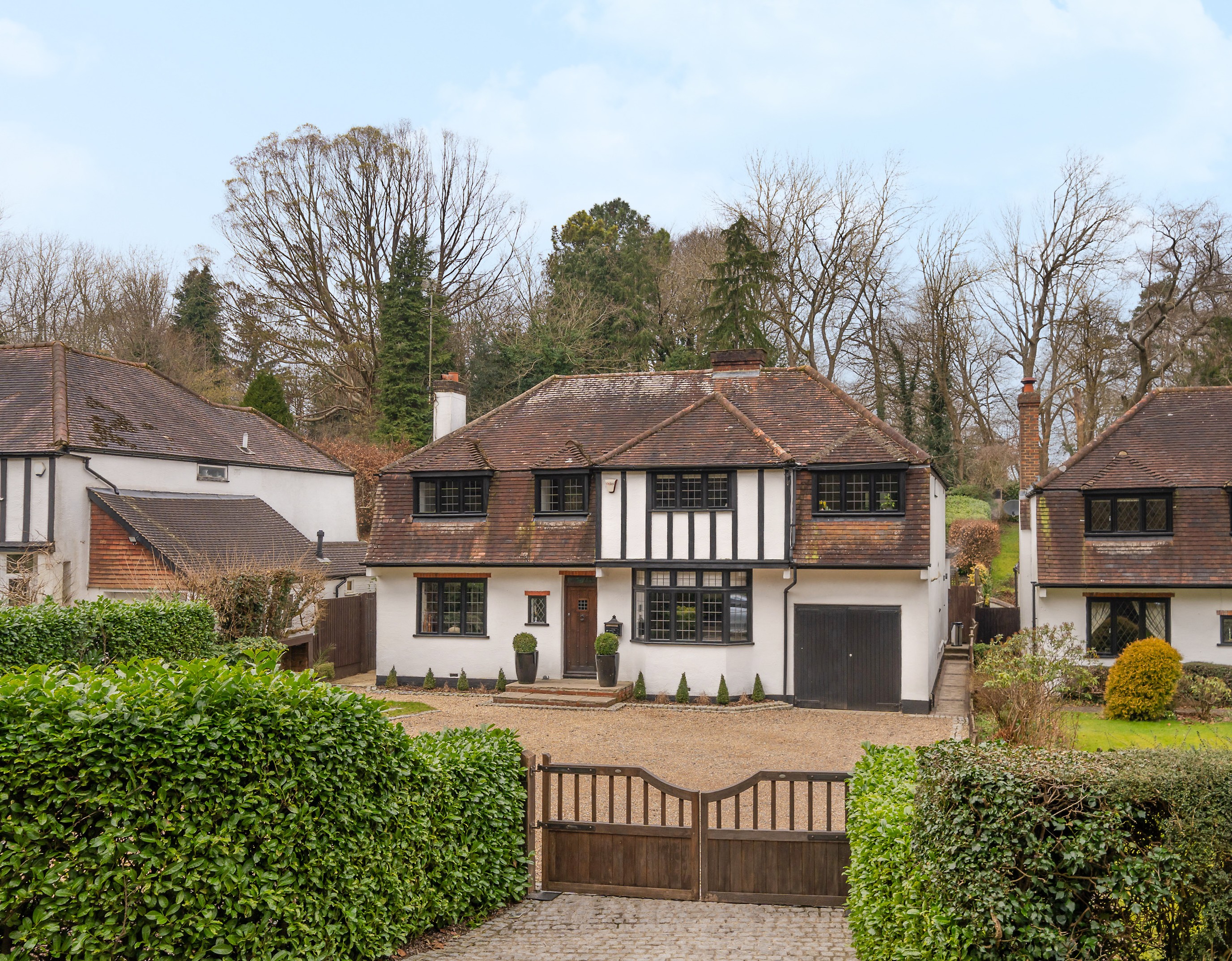 Outside, the secluded rear garden is mainly laid to lawn with mature trees and shrubs, has a patio seating area, Cedar shingle Wendy house and two timber sheds. To the front there is an extensive gated driveway for numerous cars, storage garage for bikes and side access.