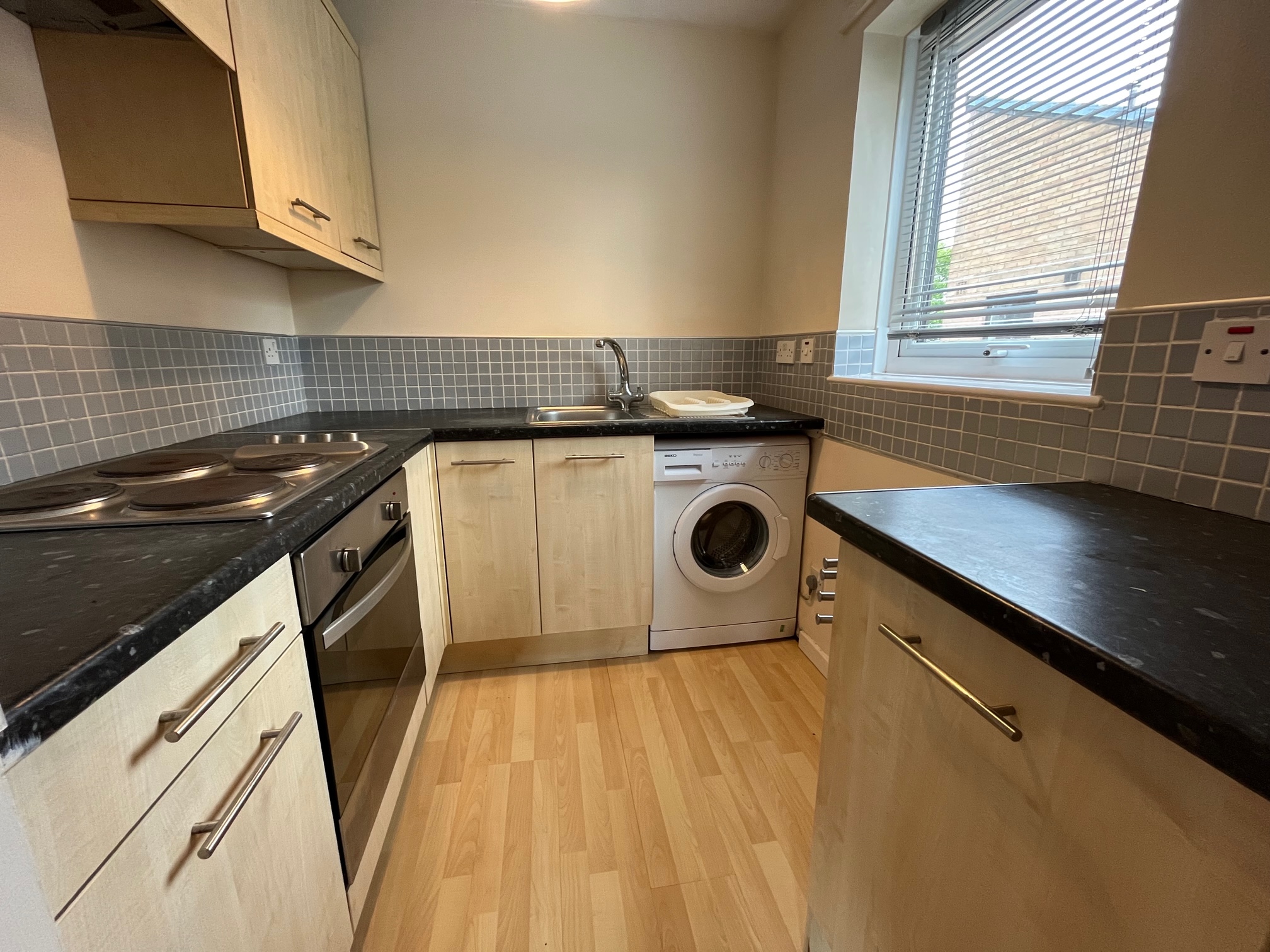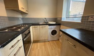 with range of base and wall cupboards, work surfaces, oven and hob, fridge/freezer* and washing machine* Items marked with * are for tenants use whilst working, landlord will not repair or replace.