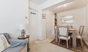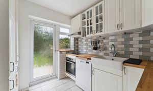 The ground floor accommodation begins with an entrance hall that includes a convenient cloakroom. This leads into a bright and airy dining area with internal access to the large garage. Beyond this, a spacious central hall provides a flexible space ideal for home working or a second reception area, with stairs rising to the first floor. To the rear, the sitting room features French doors opening onto the garden, while a separate kitchen completes the ground floor layout.