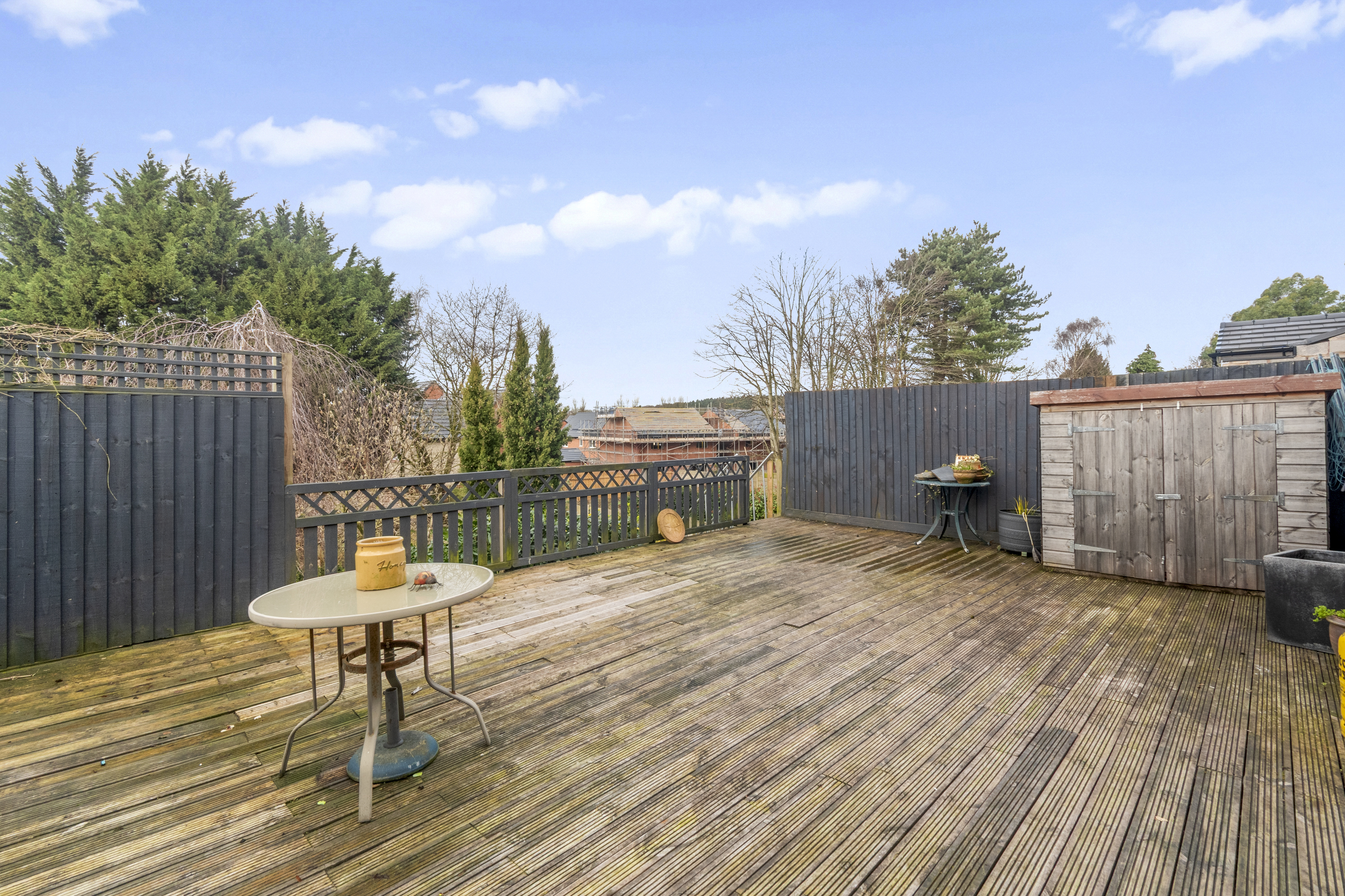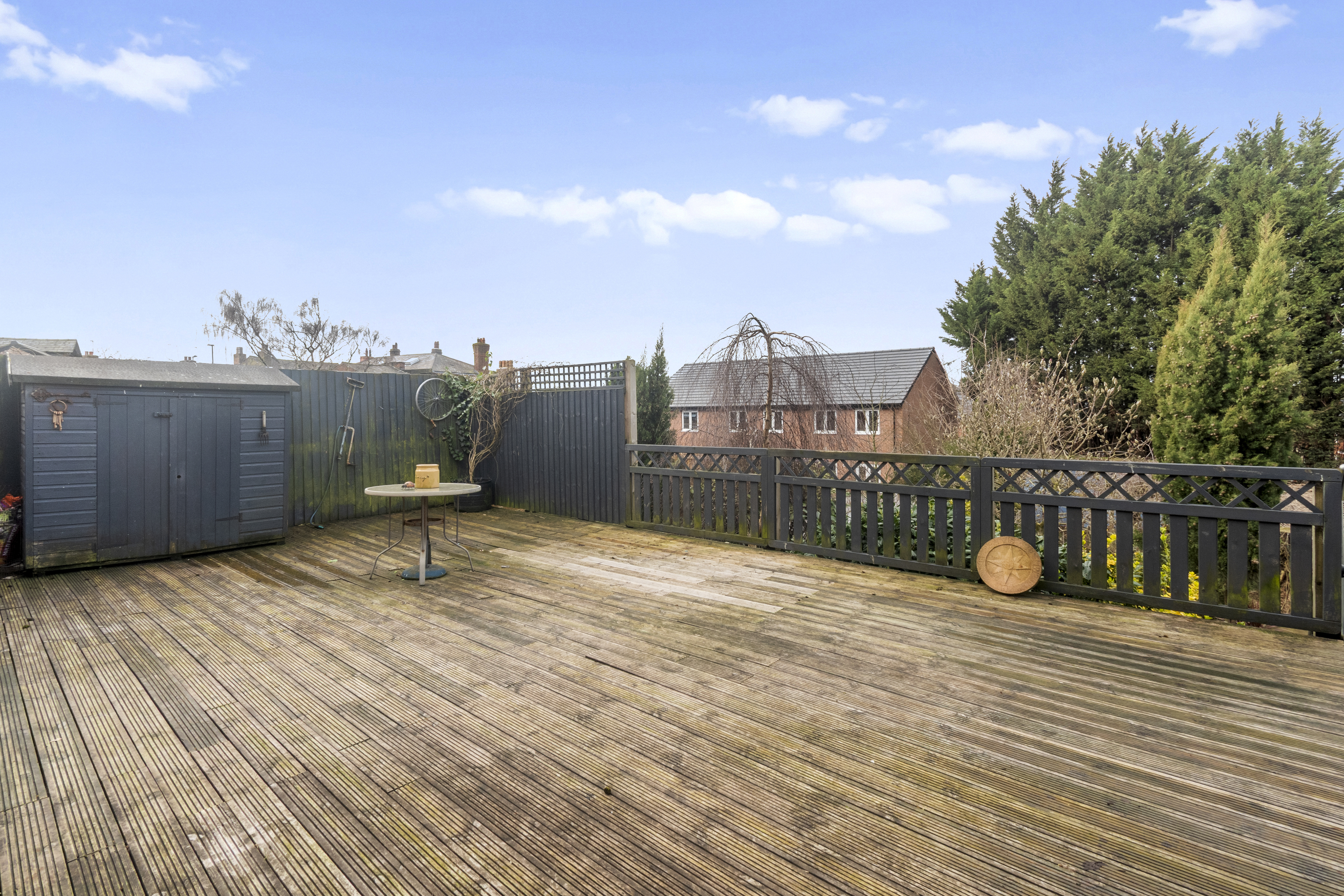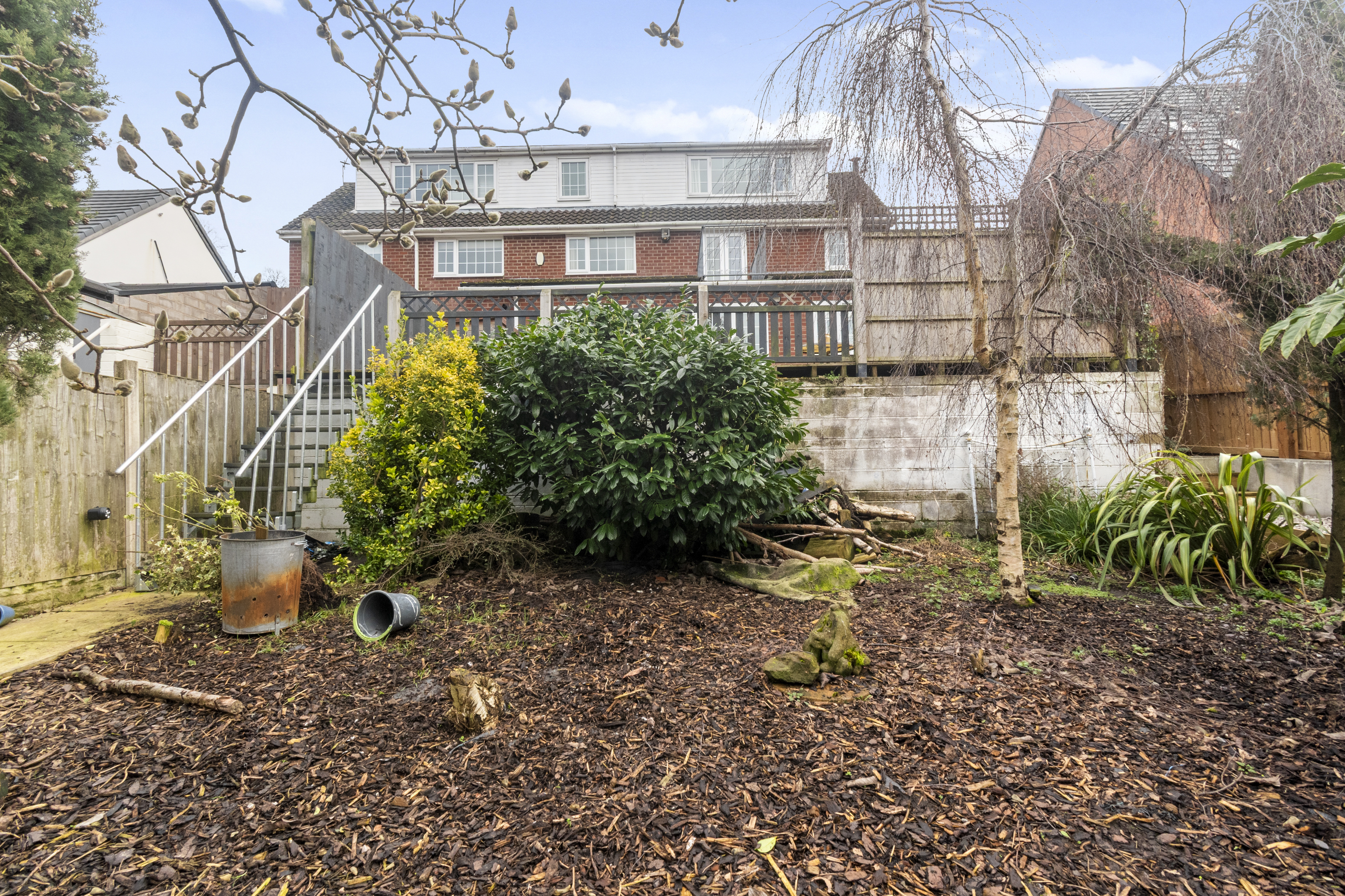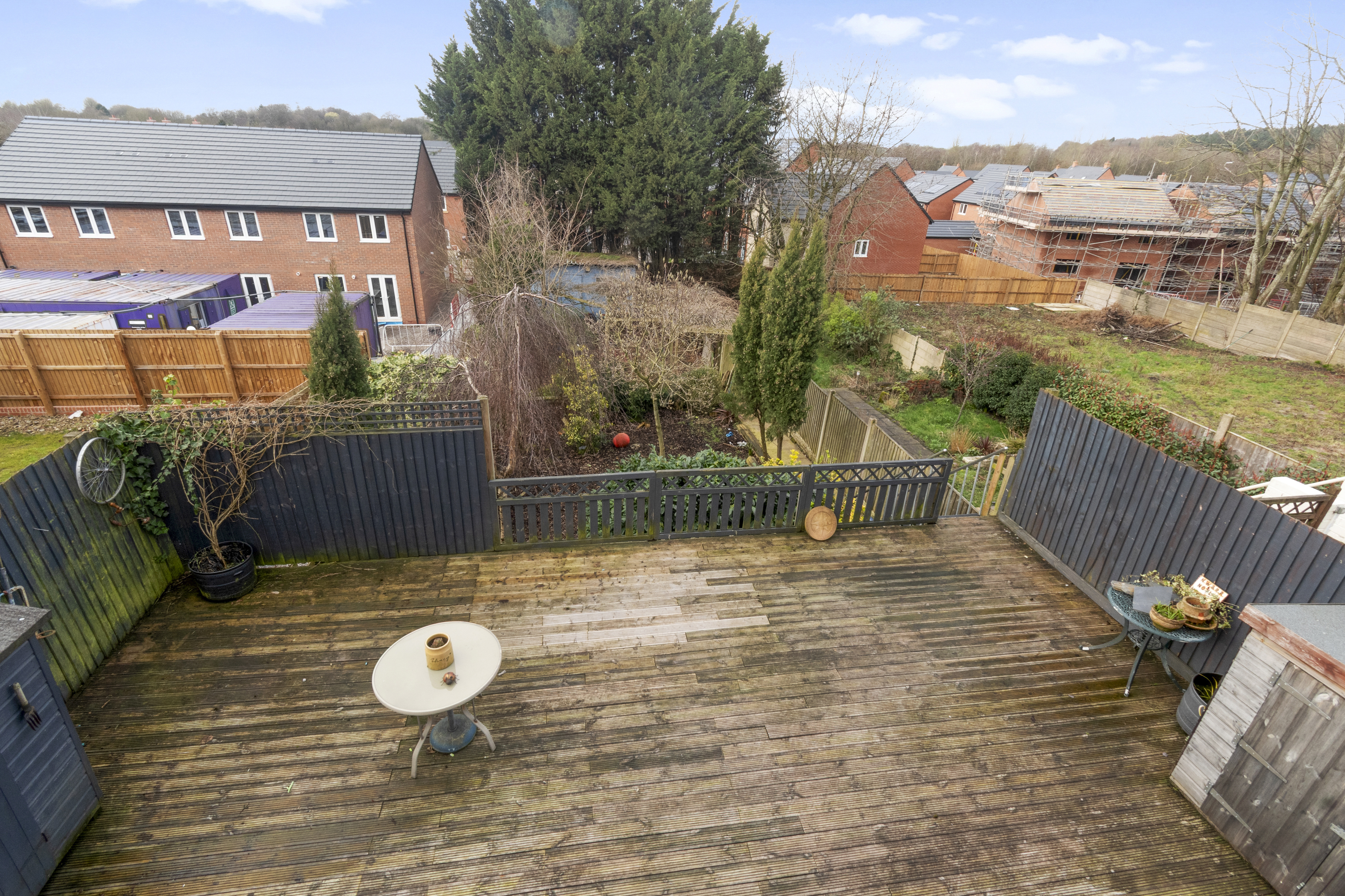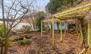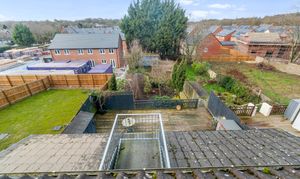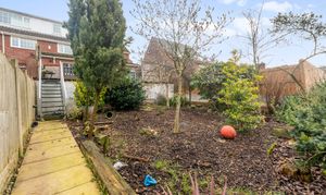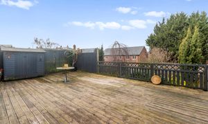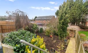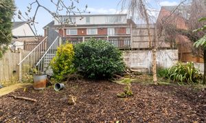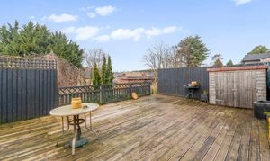 Externally, the property continues to impress with a tiered rear garden. The upper decked area is ideal for entertaining, while steps lead down to a generous garden filled with mature shrubs, greenery, and trees, offering the perfect balance between low-maintenance outdoor living and vibrant natural surroundings.