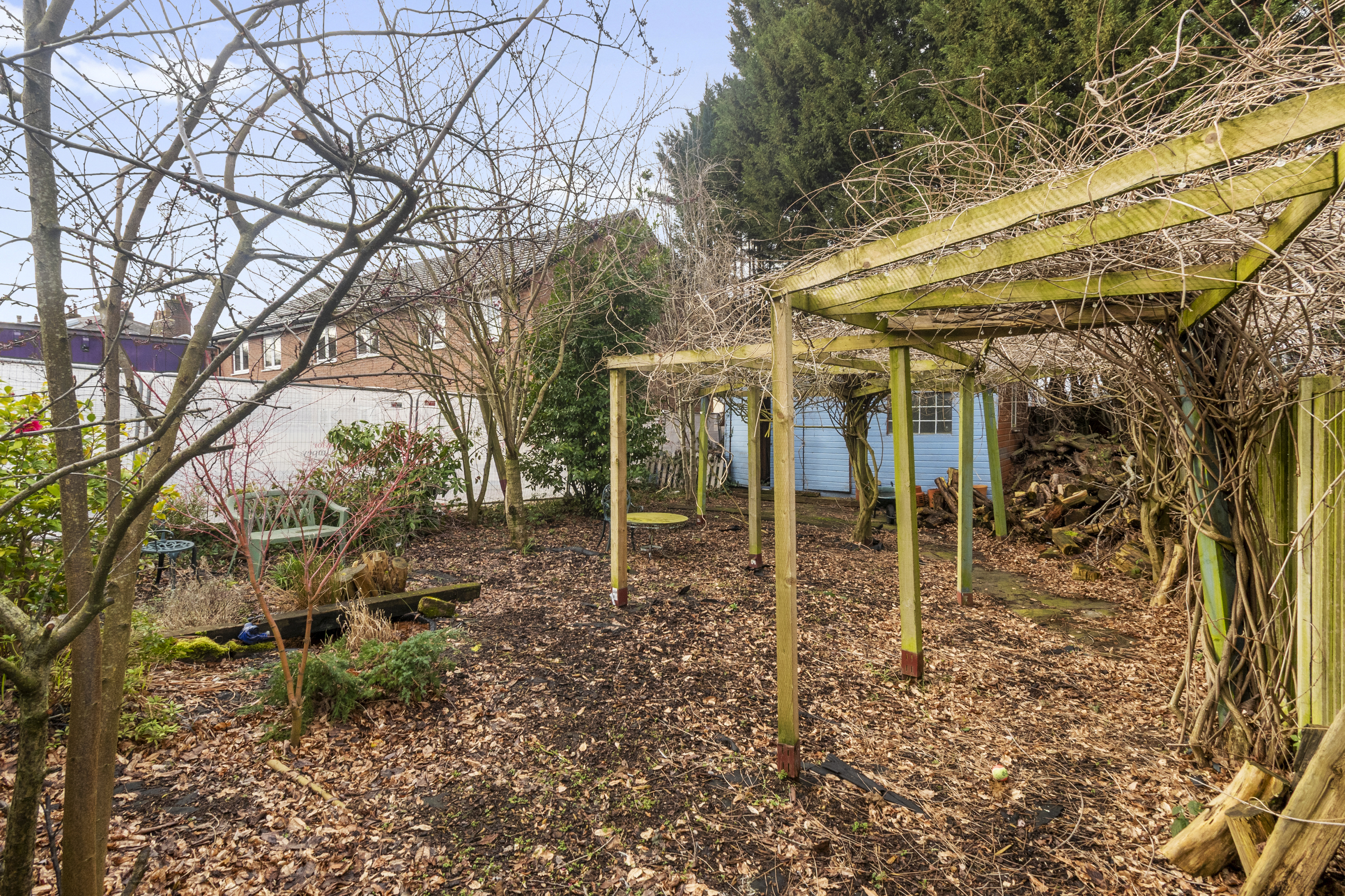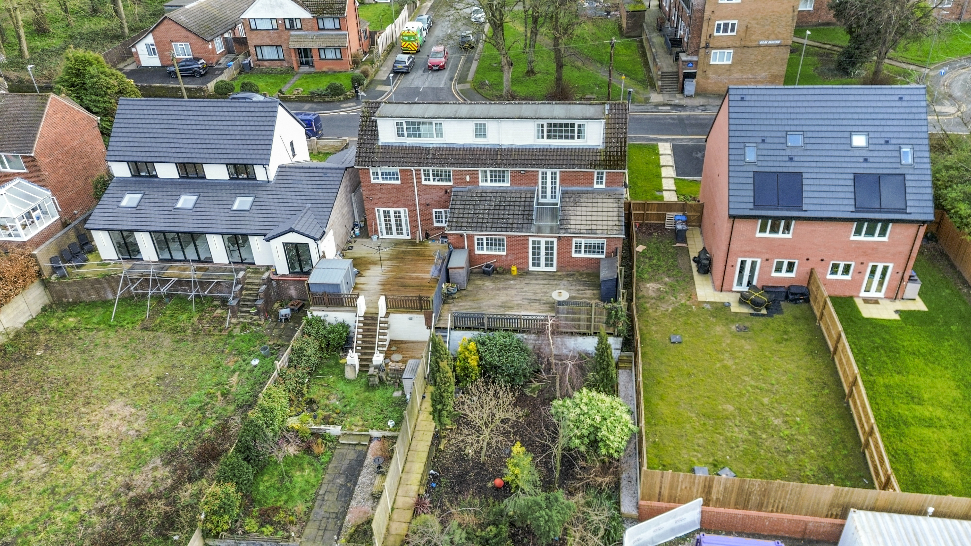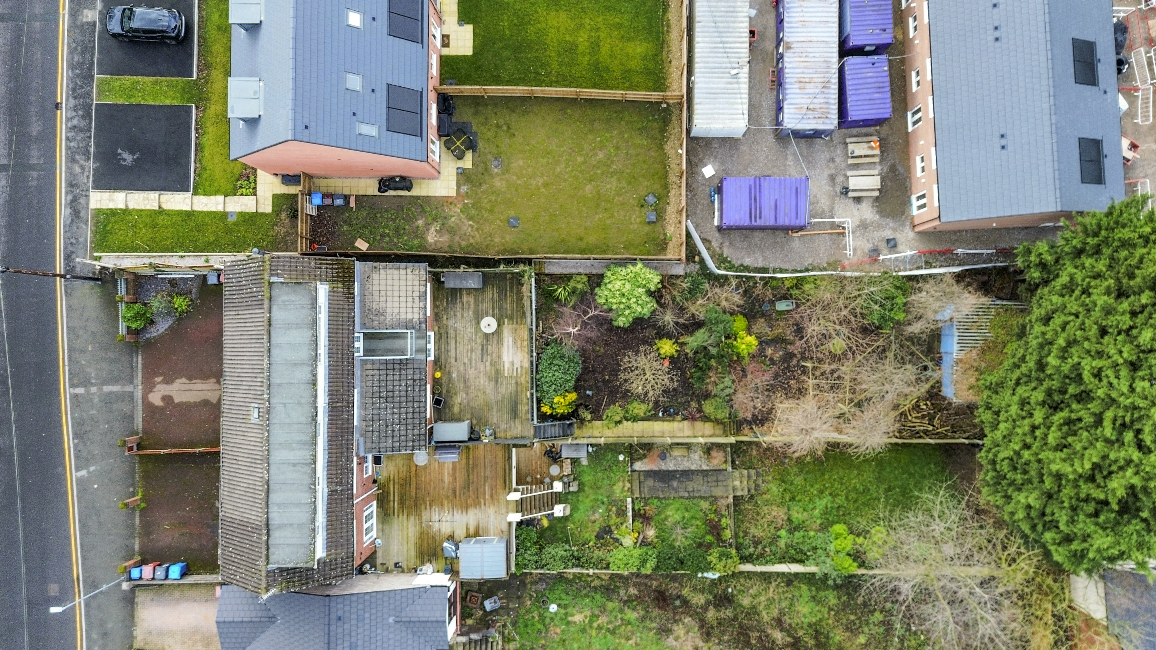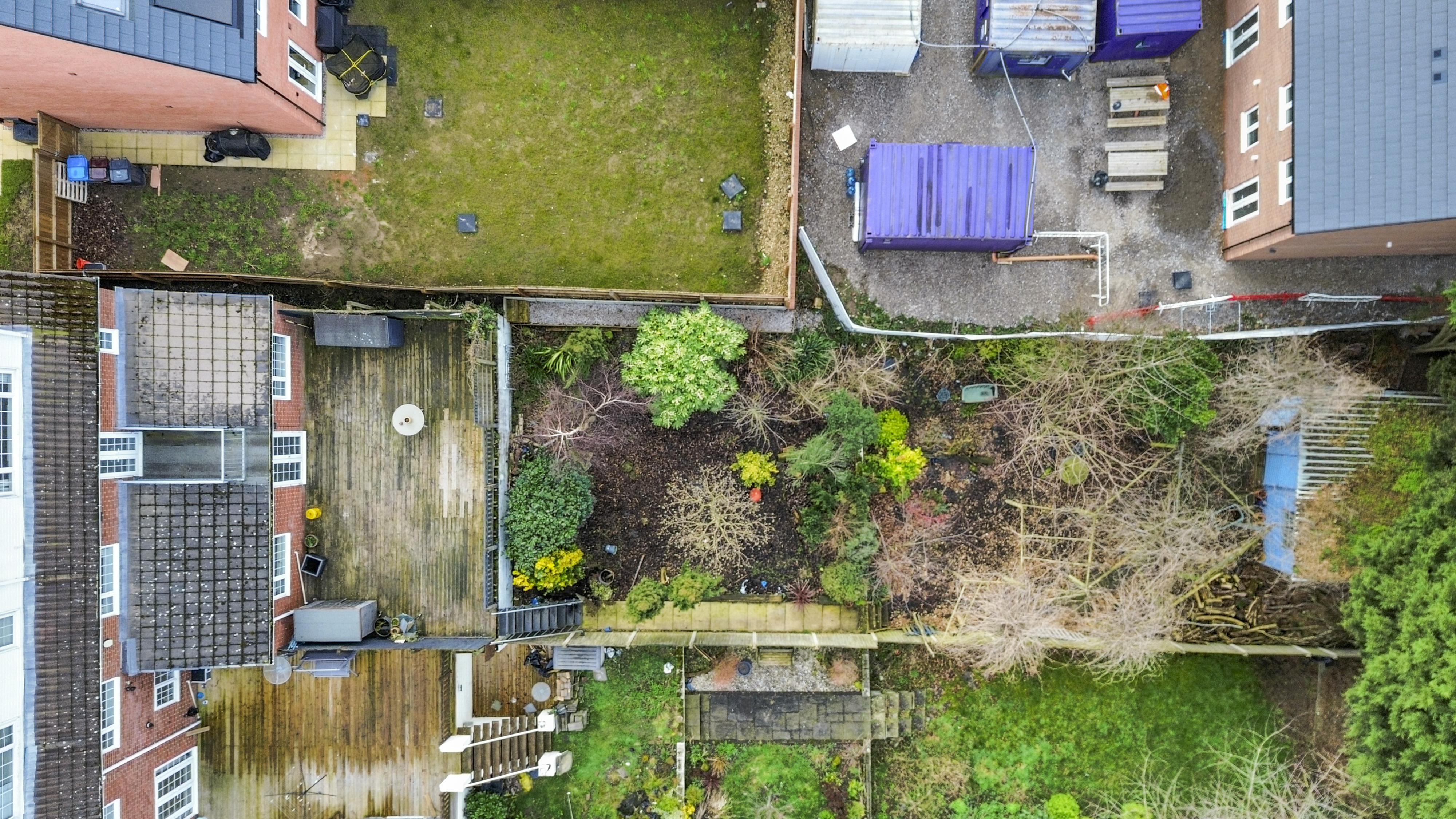 Externally, the property continues to impress with a tiered rear garden. The upper decked area is ideal for entertaining, while steps lead down to a generous garden filled with mature shrubs, greenery, and trees, offering the perfect balance between low-maintenance outdoor living and vibrant natural surroundings.
