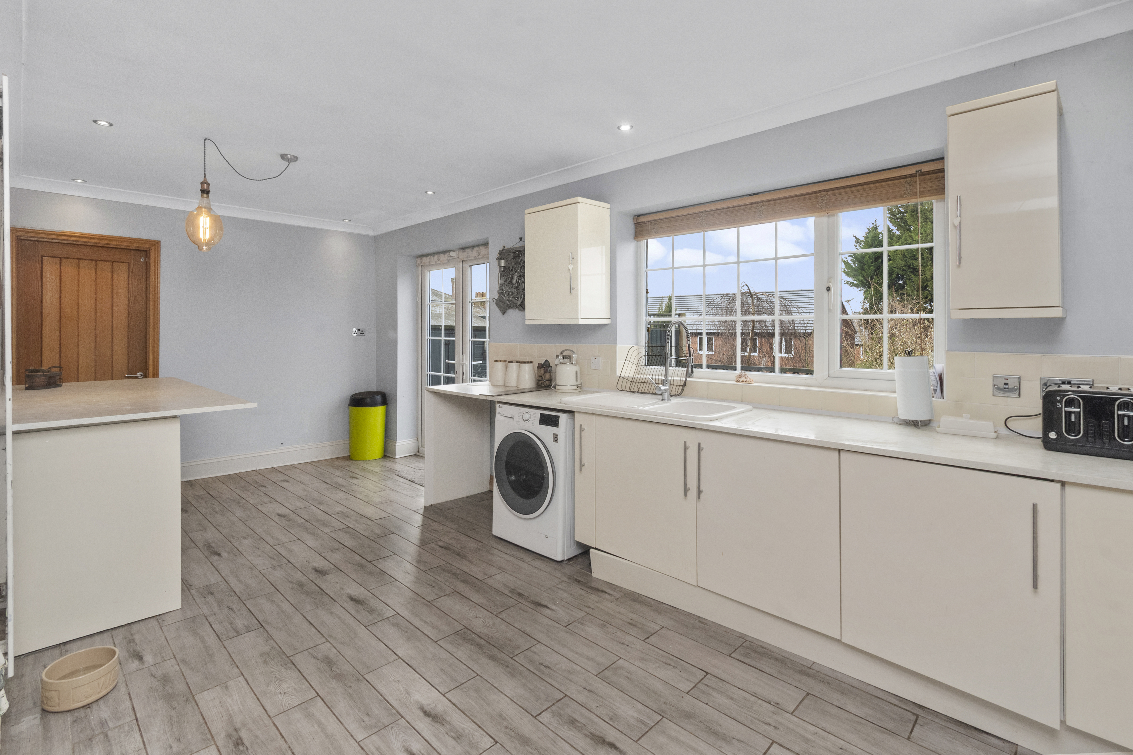 To the rear of the property, the heart of the home is the open-plan kitchen and dining area, designed for both everyday living and entertaining. French patio doors open directly onto a raised decked area, seamlessly connecting indoor and outdoor spaces and providing the perfect setting for gatherings with family and friends.