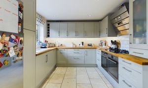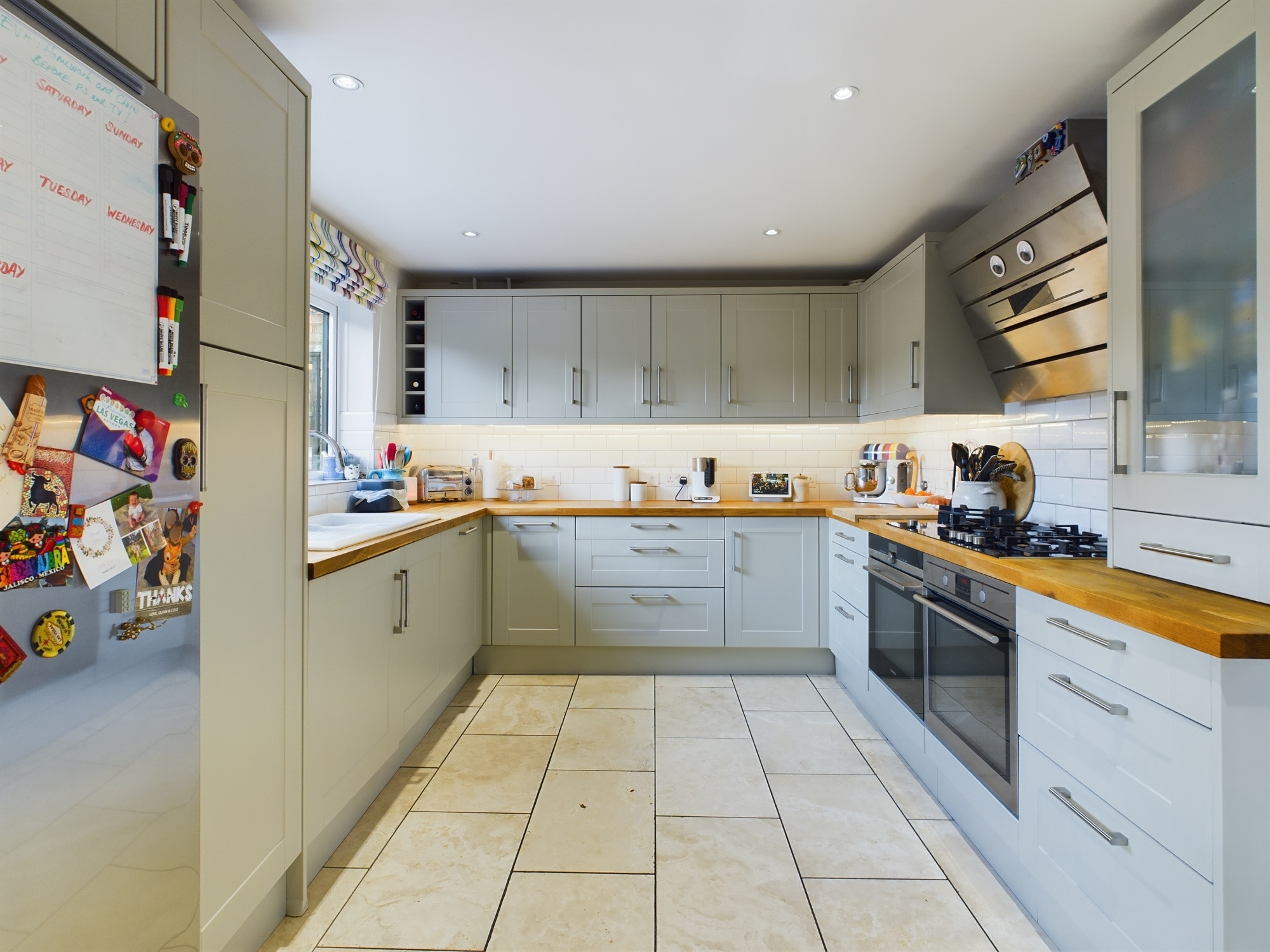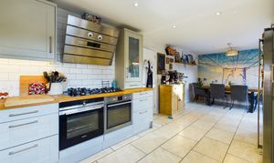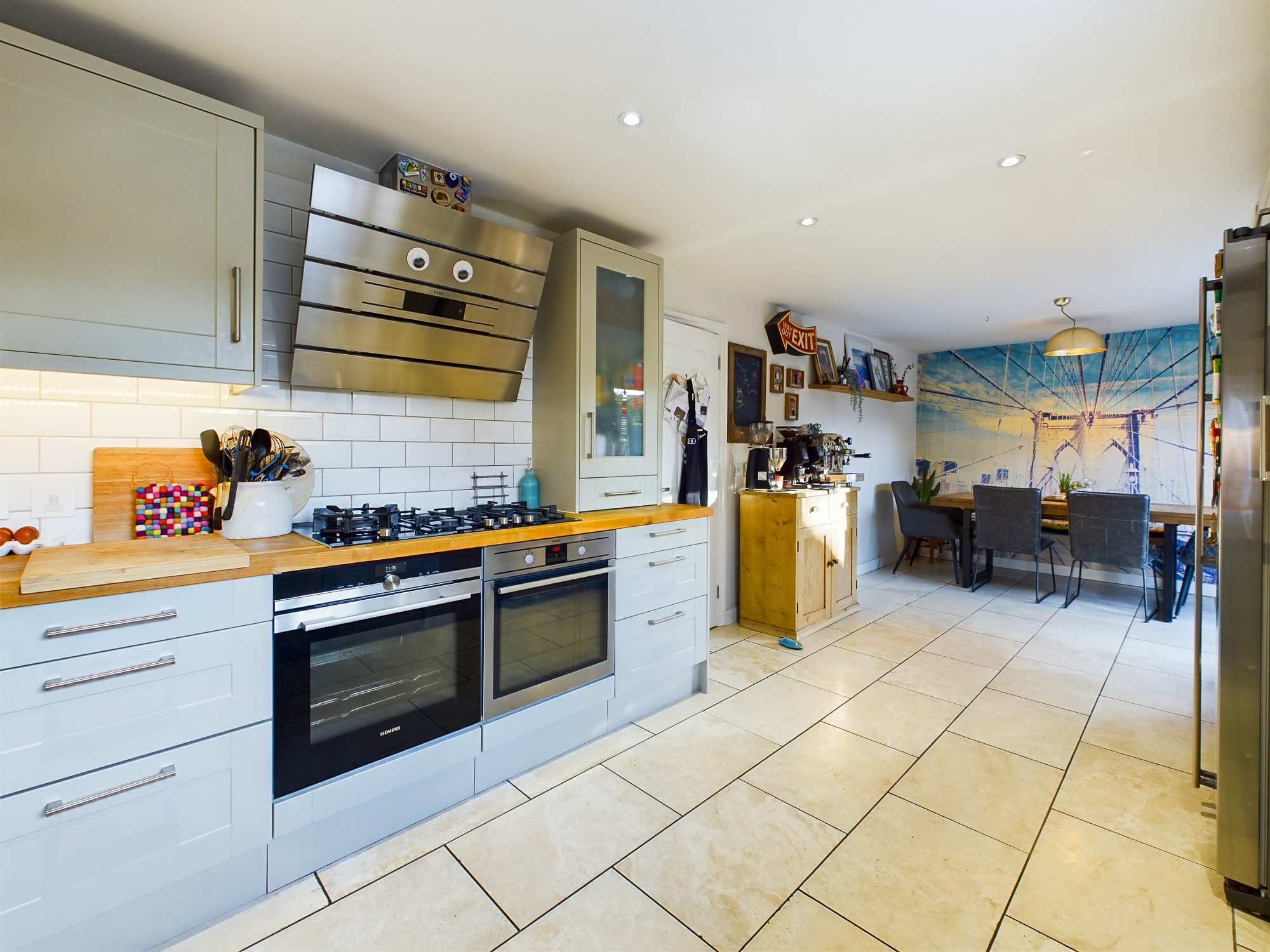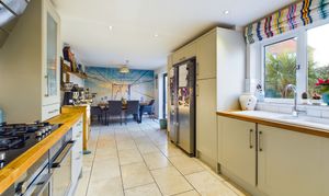 Fitted with a range of base and wall units with oak working surfaces, under unit lighting and tiled splash backs. Ceramic sink with mixer tap, 'American style' fridge/freezer, integrated dishwasher, double oven, five ring gas hob including a wok burner and extractor. Ceramic tiled flooring. Window and French doors to the rear. Underfloor heating.