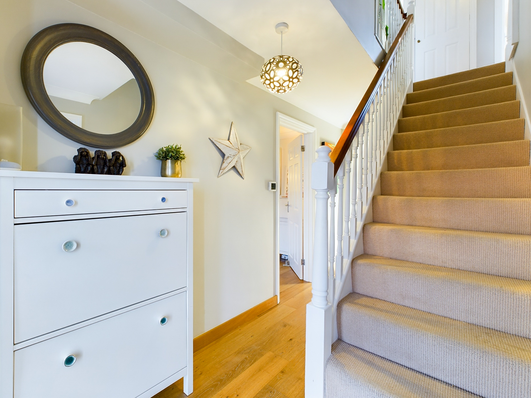 Entered under a storm porch. Stairs to the first floor with storage cupboard. Oak floor with underfloor heating.