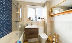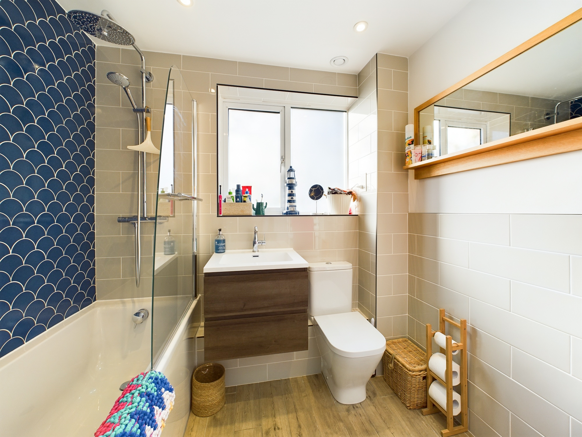 Fitted with a three-piece suite comprising bath, shower with both handheld and rainfall shower heads and pivoting glass screen, wash basin with storage beneath and a W.C. Heated towel rail. Window to the rear. Extractor fan and shaver point.