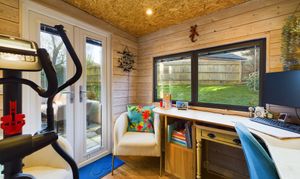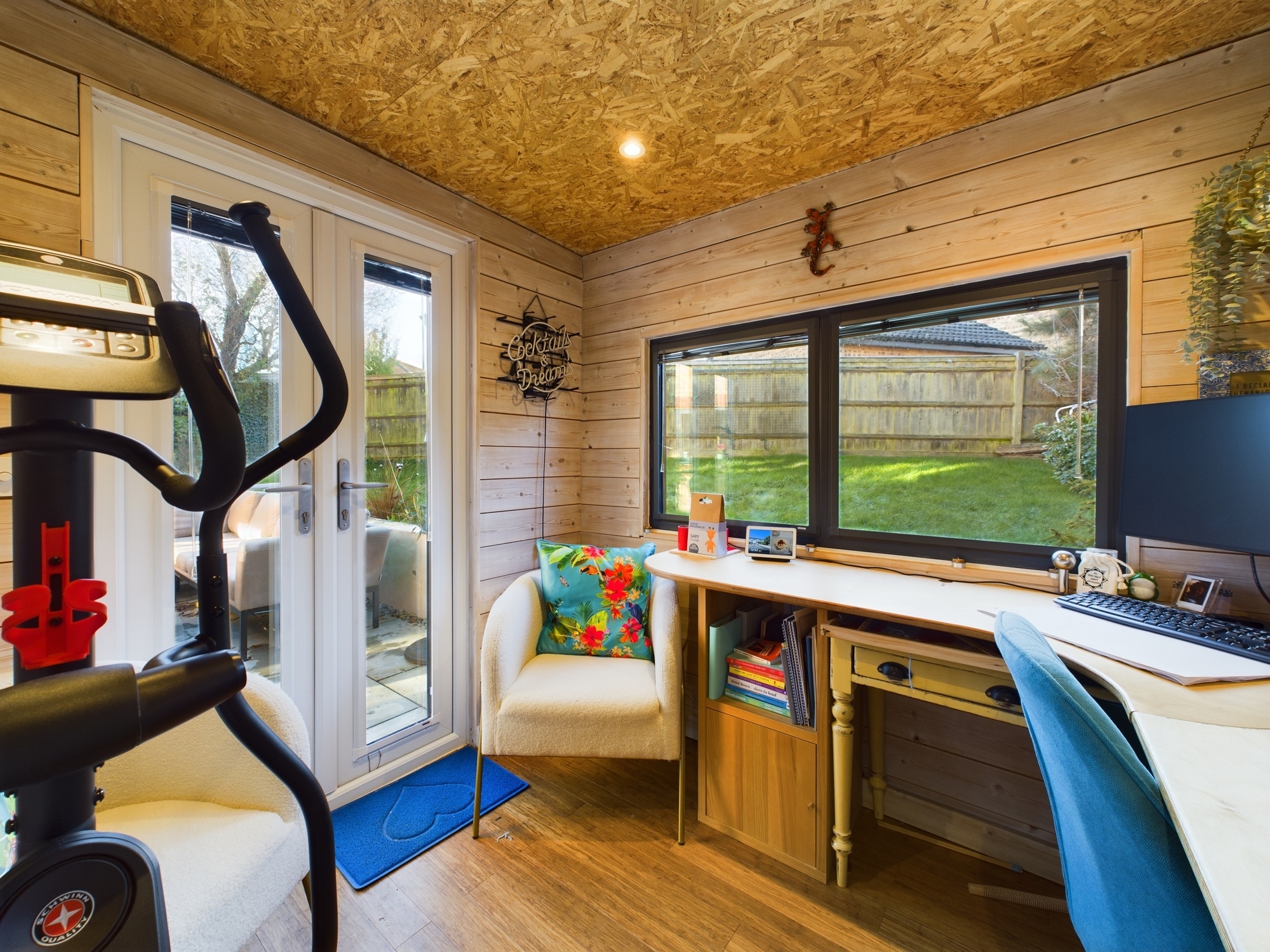 Of timber construction, insulated and with double glazed windows to the side and rear. Entered via French doors. Power and light connected.