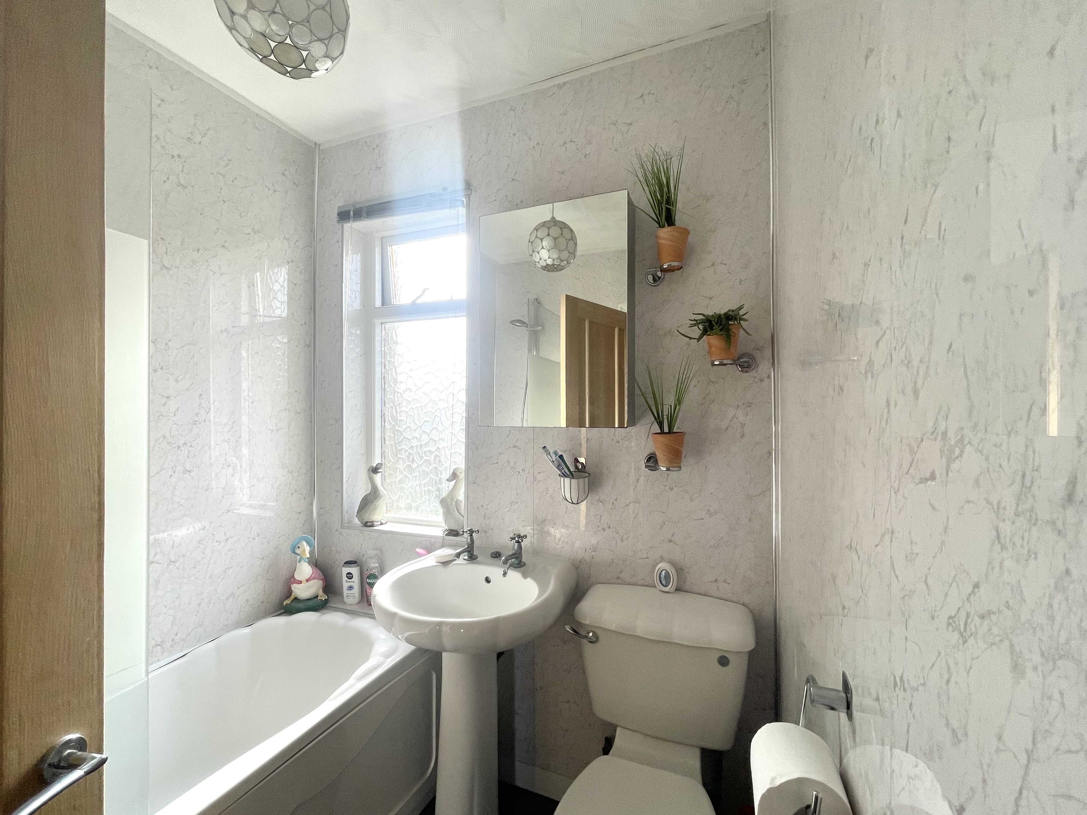 With a ceiling light point, frosted timber and sealed unit double glazed window, central heating radiator, easy clean panelled walls and fitted with a suite comprising panelled bath with glazed shower screen together with mixer tap incorporating hand spray, pedestal wash basin and low flush w.c.