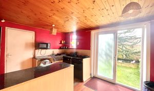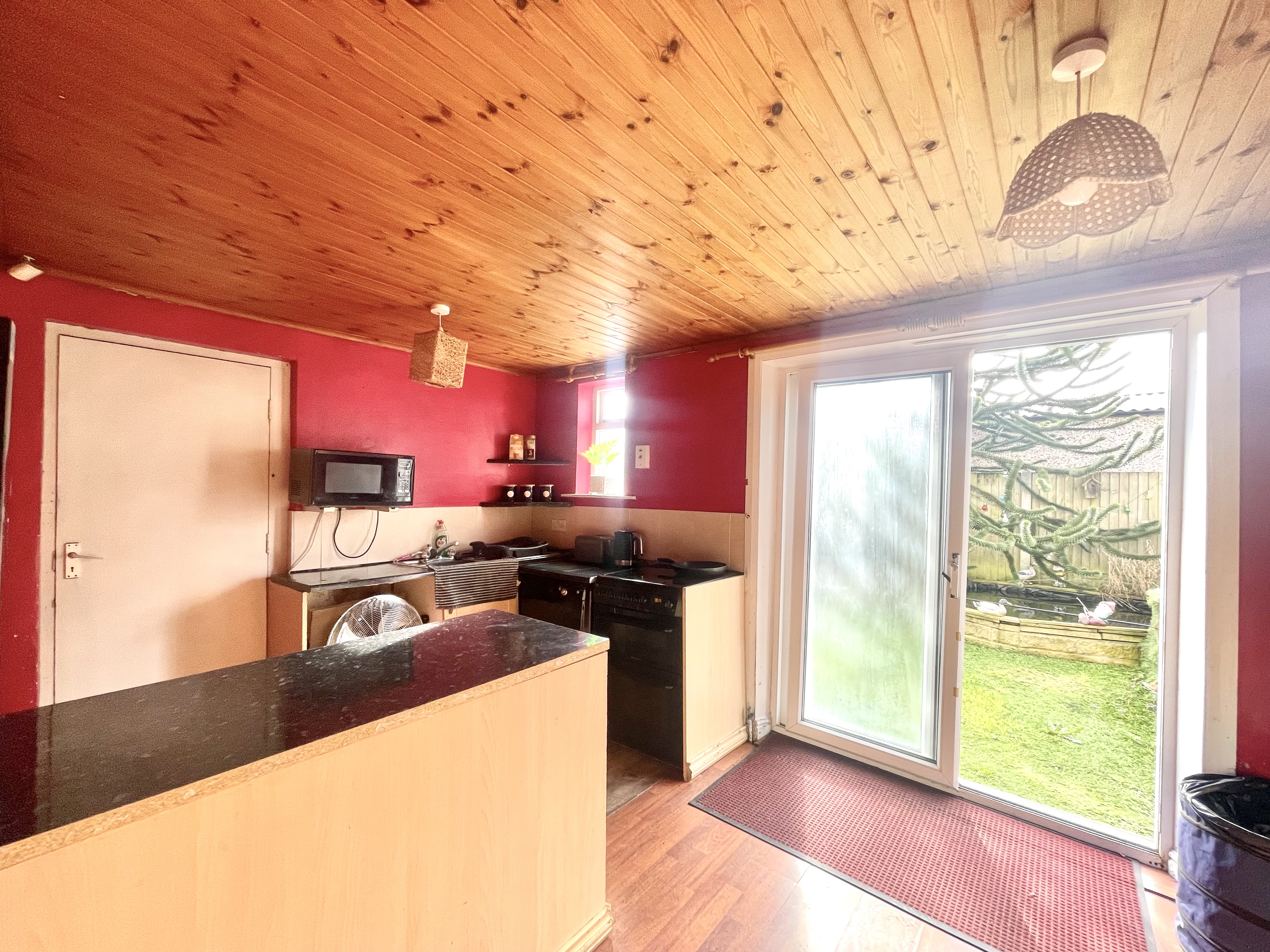 With uPVC double glazed sliding patio doors giving access to the rear garden together with an adjacent timber and sealed unit double glazed window all of which provide plenty of natural light. There are two ceiling light points, part laminate flooring and part vinyl and fitted with a range of base and wall cupboards, drawers, contrasting overlying worktops, inset single drainer stainless steel sink with mixer tap and tiled splashbacks, electric cooker point and plumbing for dishwasher. There is a recess beneath the stairs to house a fridge freezer and to one side a courtesy door gives access to the garage.