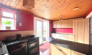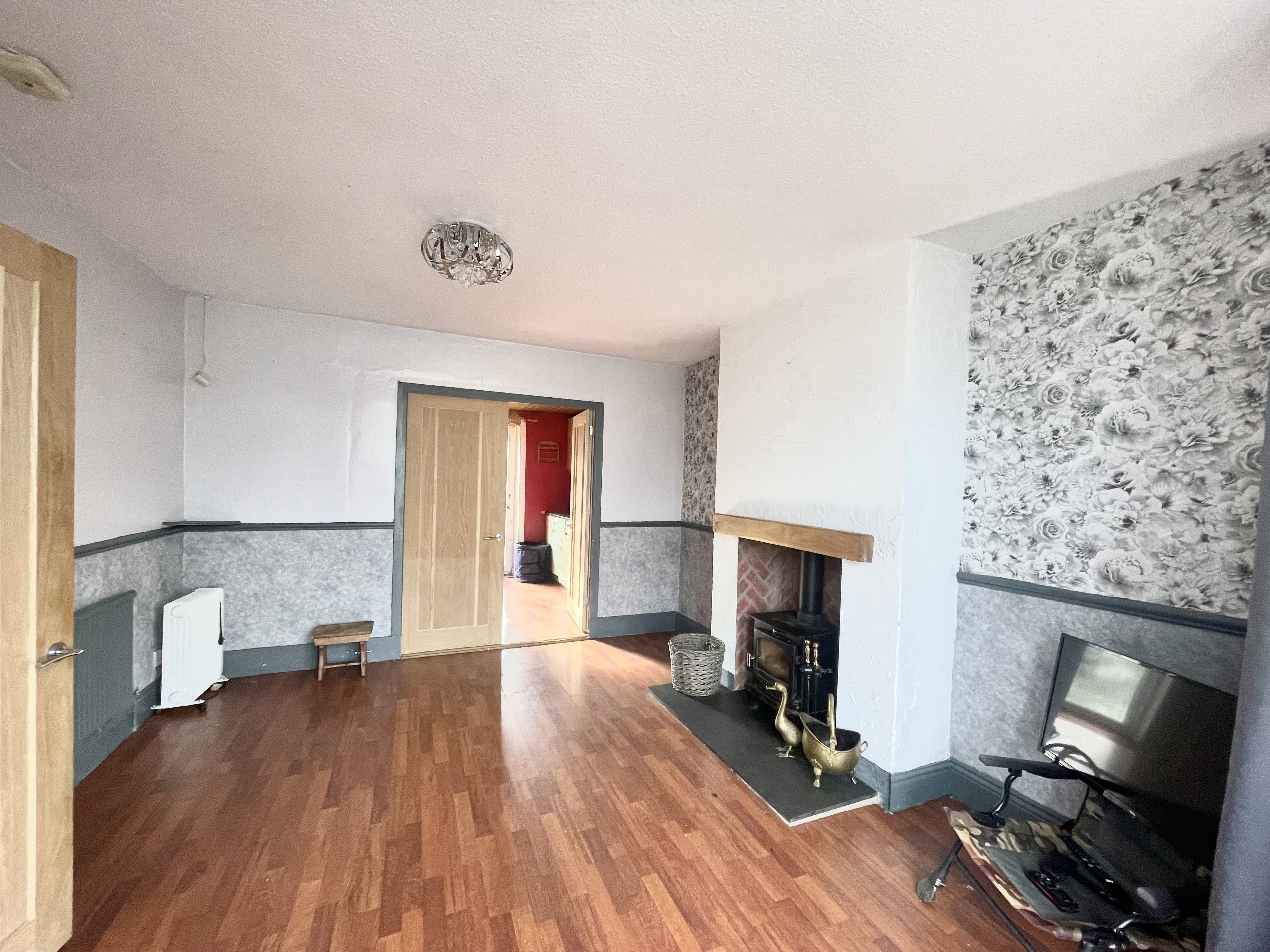 A comfortable reception room which has a walk-in bay with timber and sealed unit double glazed mullioned windows which provide the room with plenty of natural light. There is a ceiling light point, central heating radiator and as the main focal point of the room housed within the chimney breast there is a multi-fuel stove with oak mantle over. To the rear of the living room twin timber doors open into the kitchen.