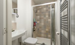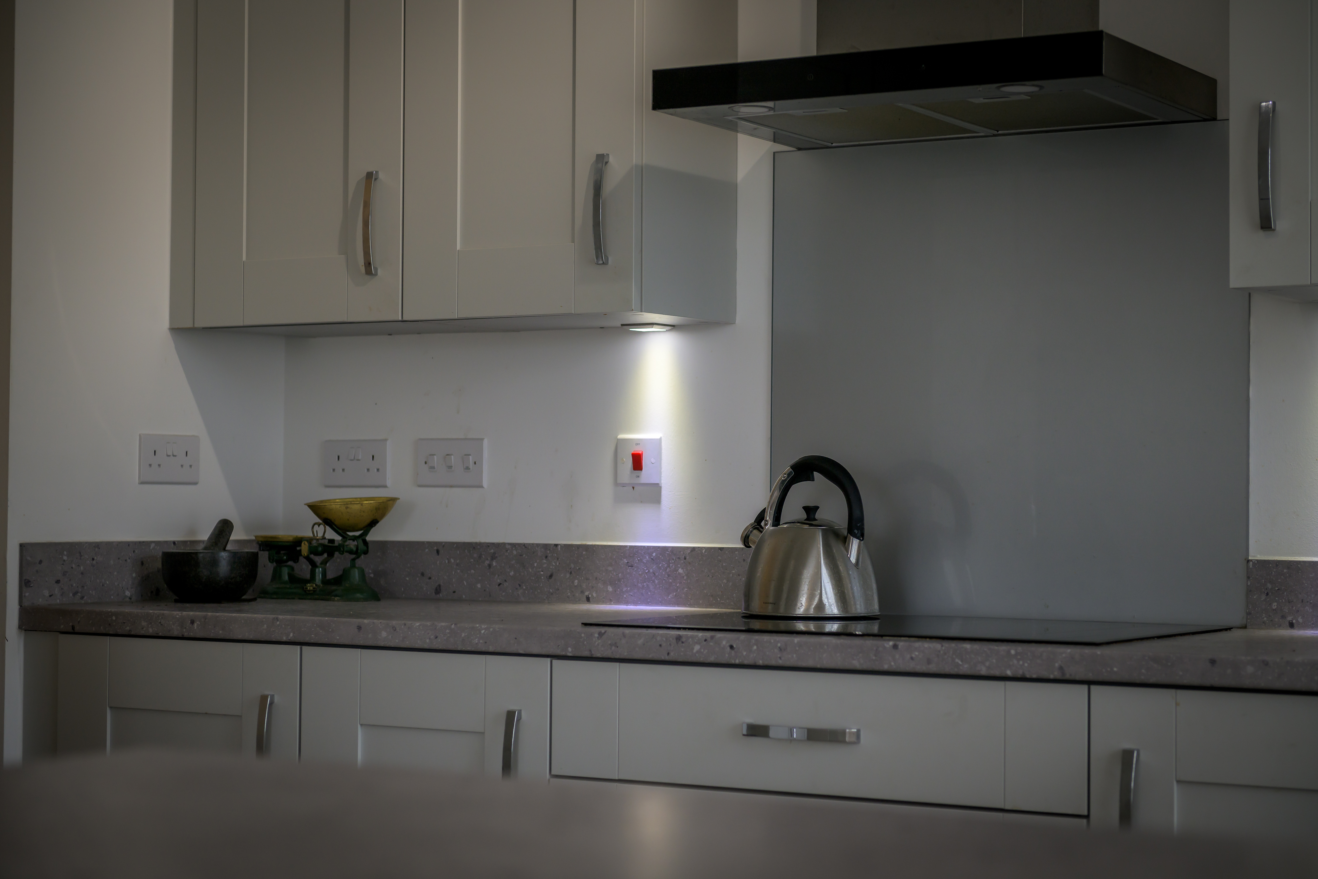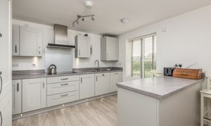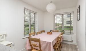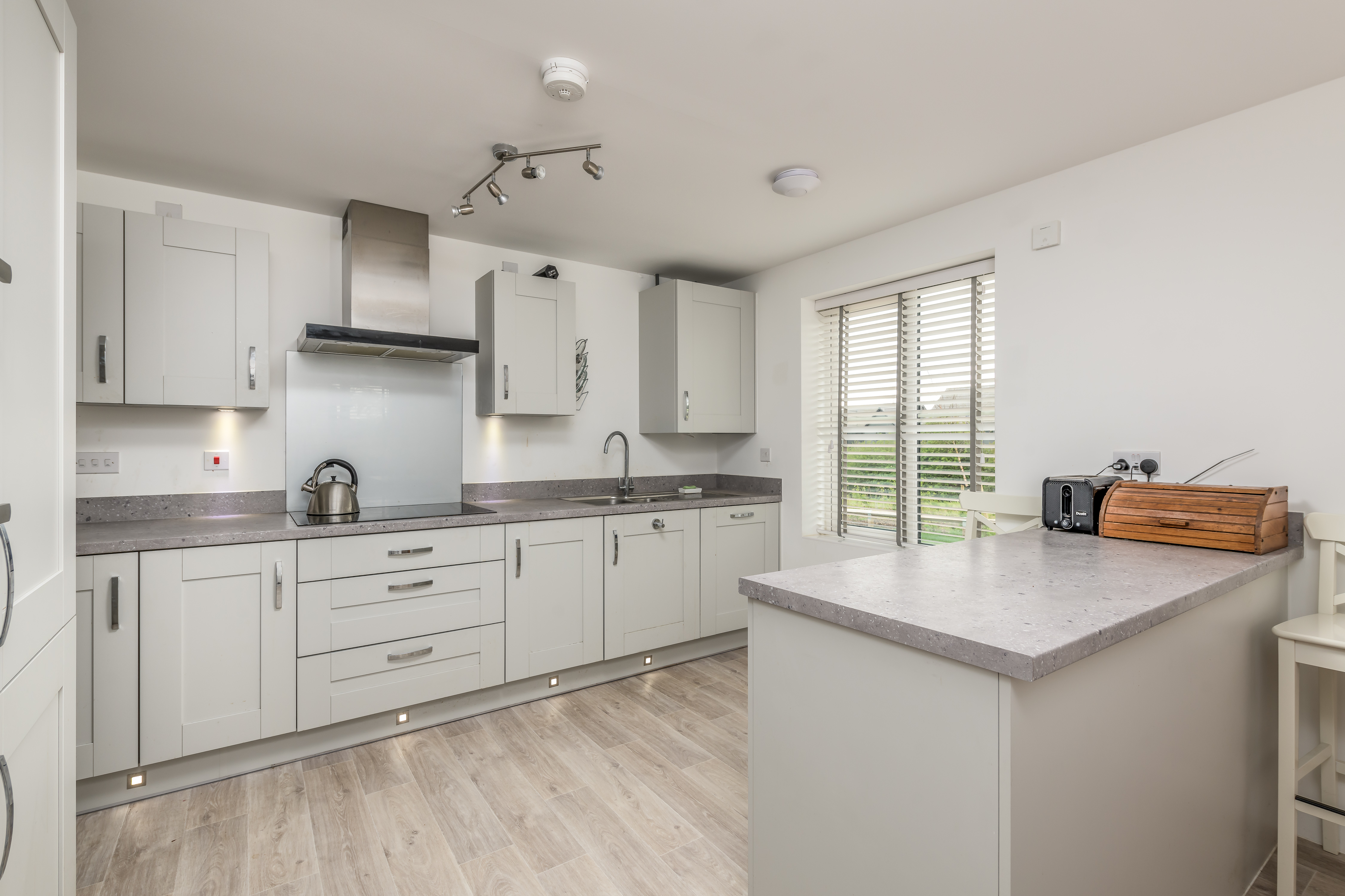 The kitchen/diner room to the other side of the house is open plan, ideal for that feeling of togetherness whether with family or friends. Dinner parties can be hosted at the dining table, and there’s a peninsula for casual breakfasts at the bar. The kitchen is fitted with light grey Shaker-style cabinetry, topped with stone-effect surfacing. There’s a stainless steel sink and drainer, integrated appliances, and the owner upgraded to an induction hob, which boils water far faster than a conventional kettle.