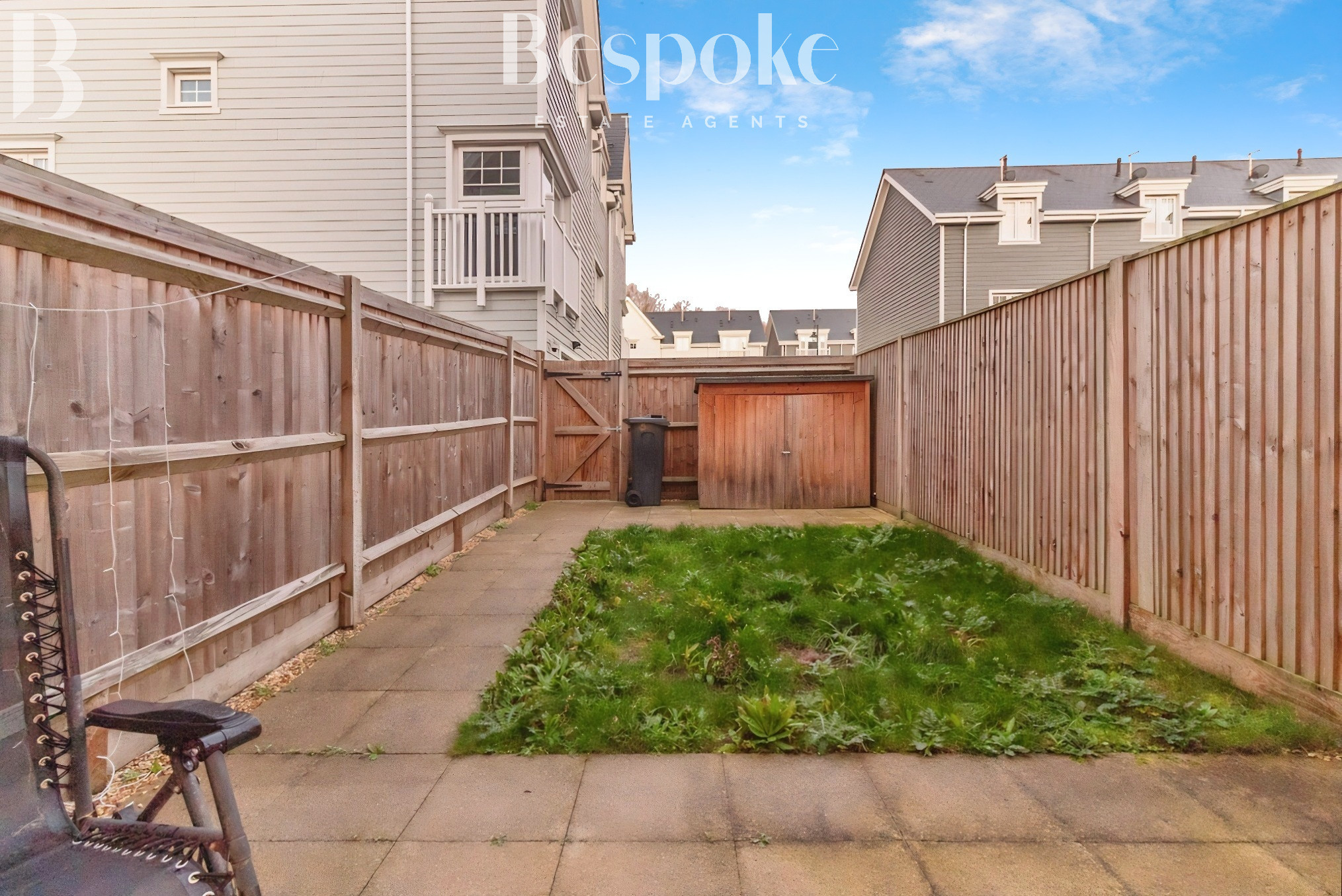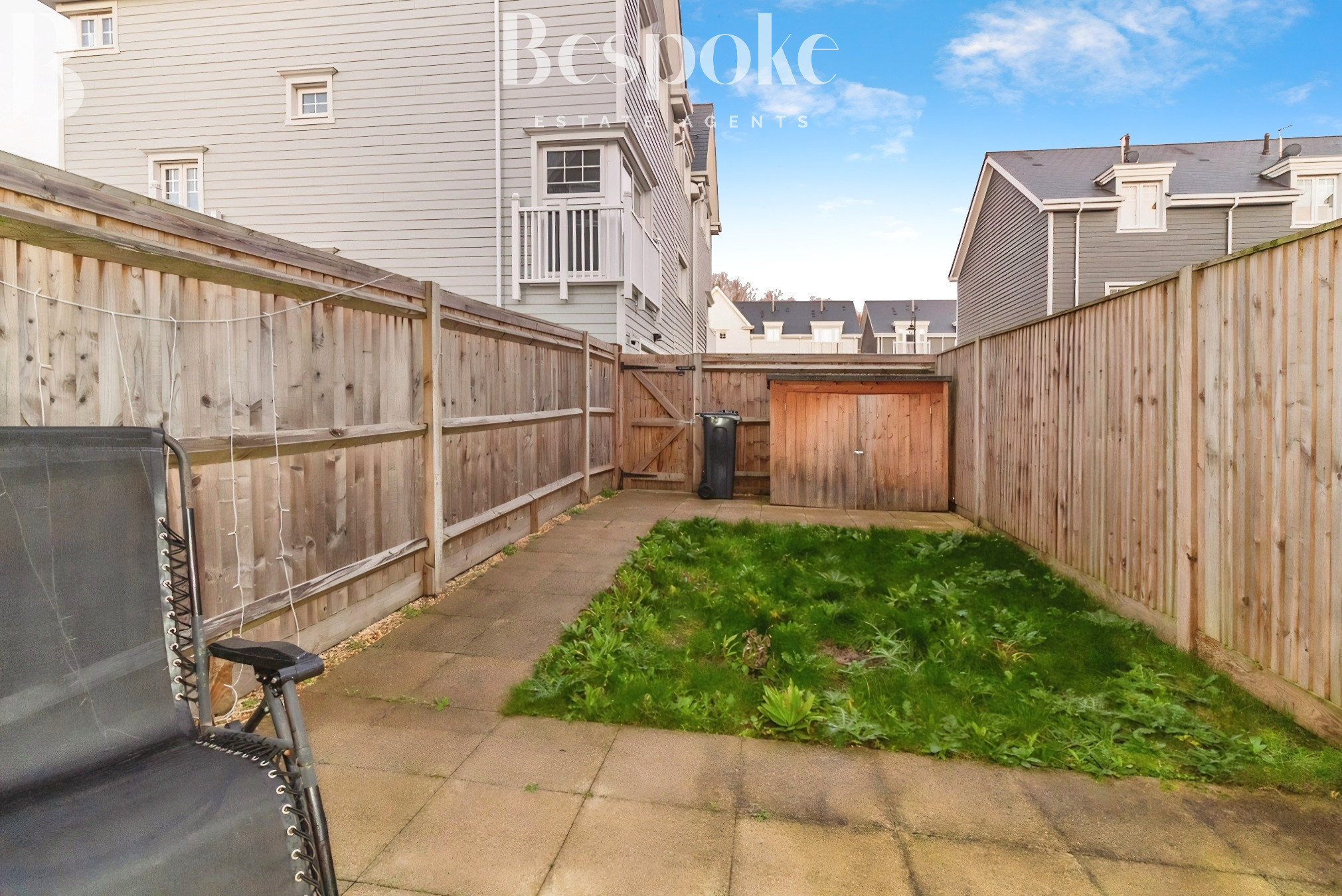- Private rear garden with patio, storage shed, and rear access
