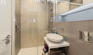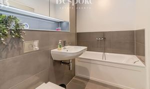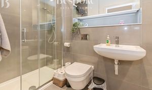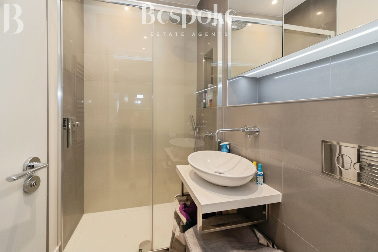 A stylish and well finished family bathroom serving the second floor accommodation. The room is fitted with a modern panelled bath, a large walk in shower with glazed enclosure, a wall hung W.C., and a contemporary wash hand basin with wall mounted tap. Large format tiling creates a clean and cohesive look, complemented by recessed lighting and a mirrored storage unit with integrated lighting. Well laid out and thoughtfully designed, this bathroom offers both comfort and practicality for family living or guest use.