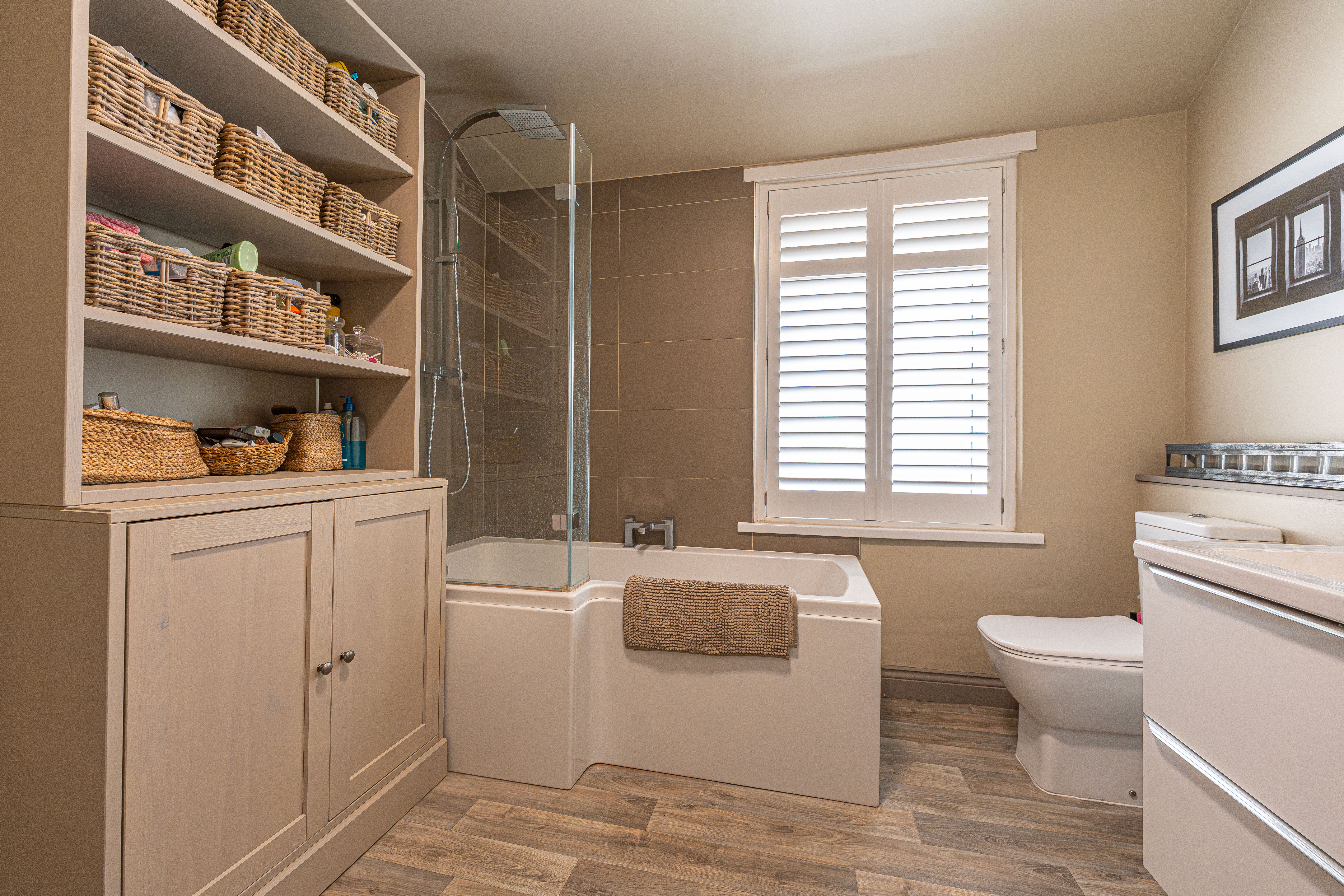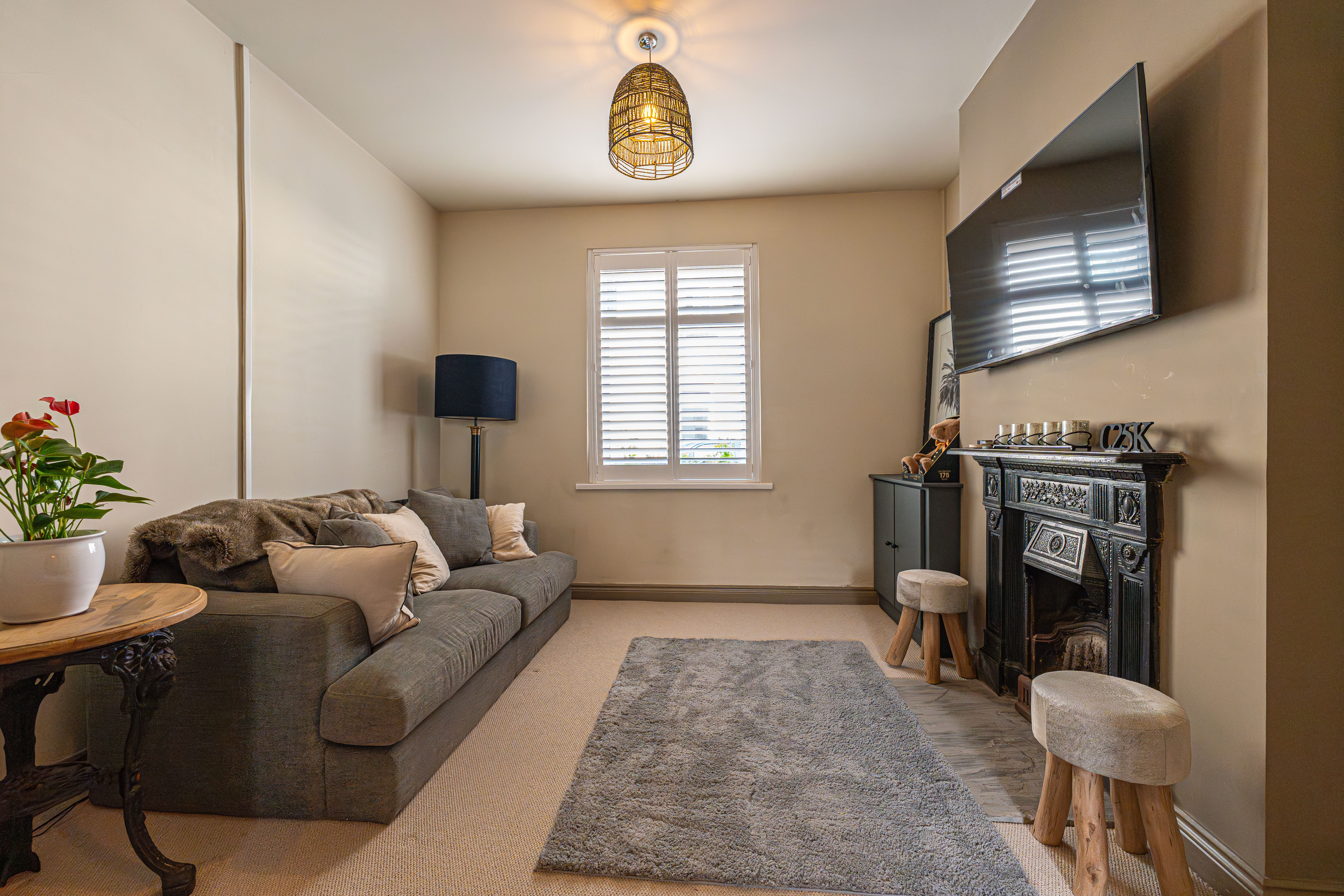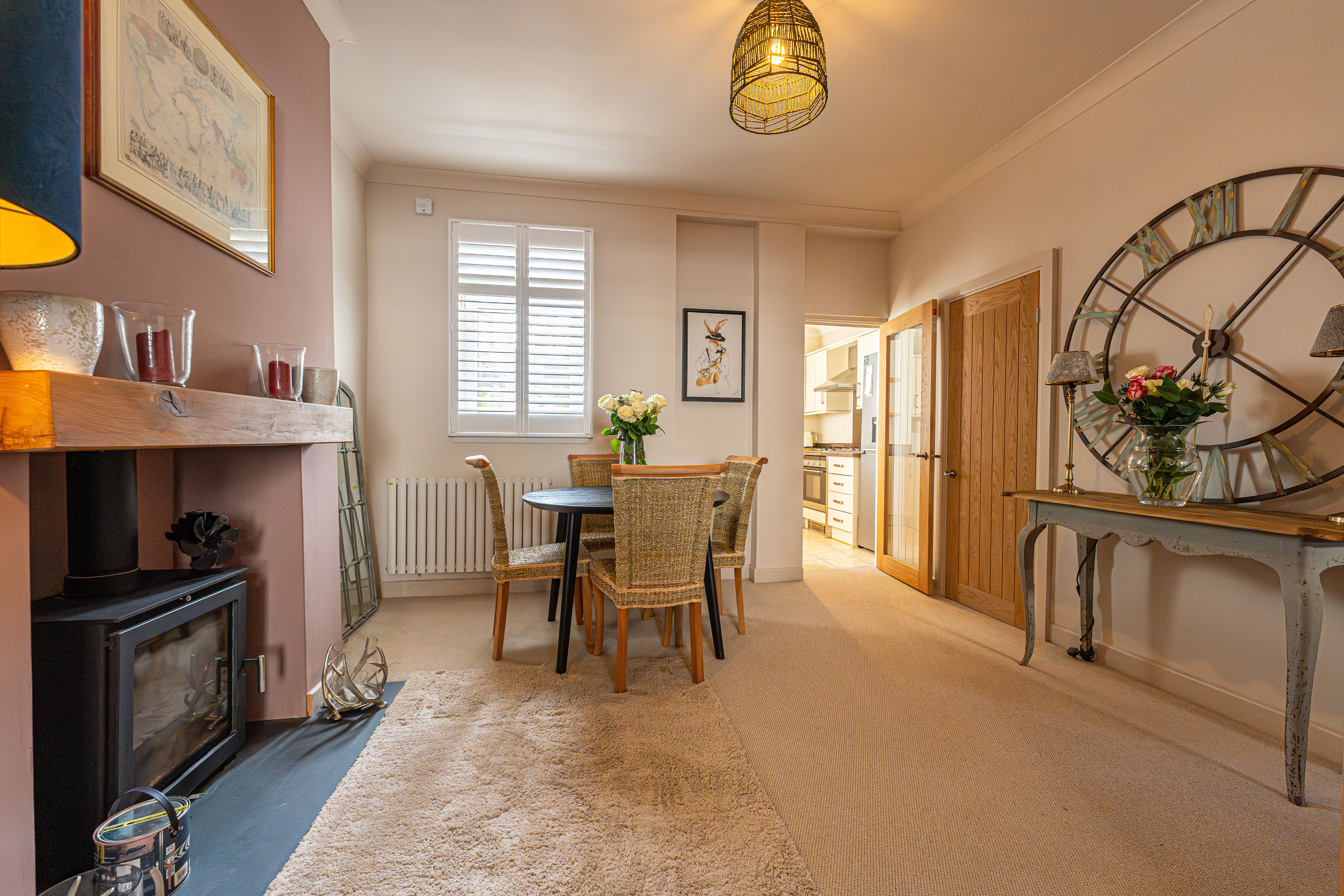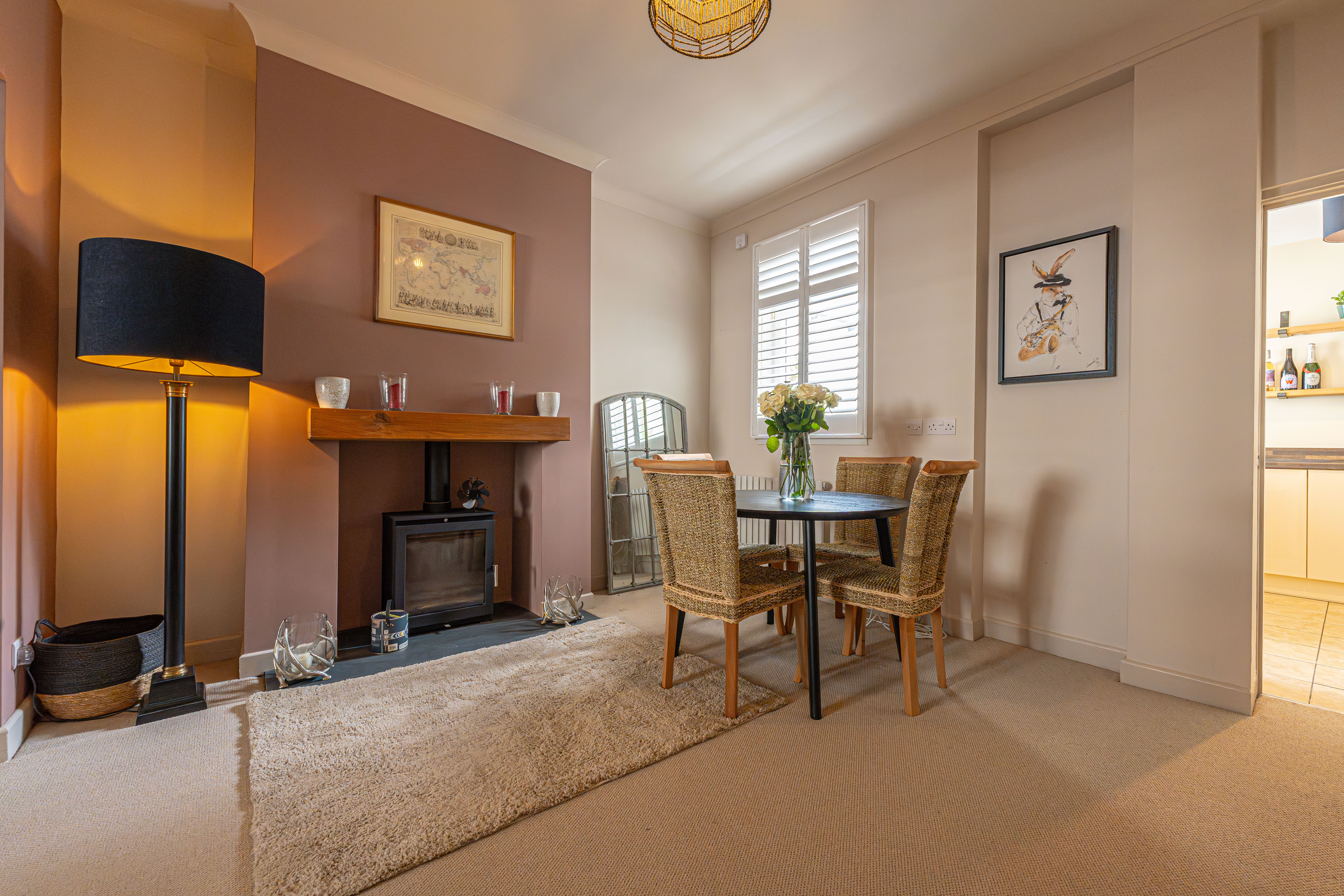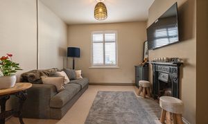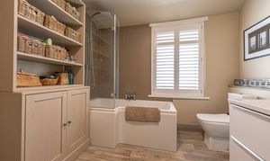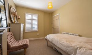 Ascending to the first floor we have two bedrooms that are both generous double rooms, each fitted with stylish shutters, while the second bedroom features another period fireplace. The spacious family bathroom is equipped with a bath suite and overhead shower, as well as a large sink and fitted airing cupboard.