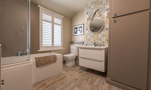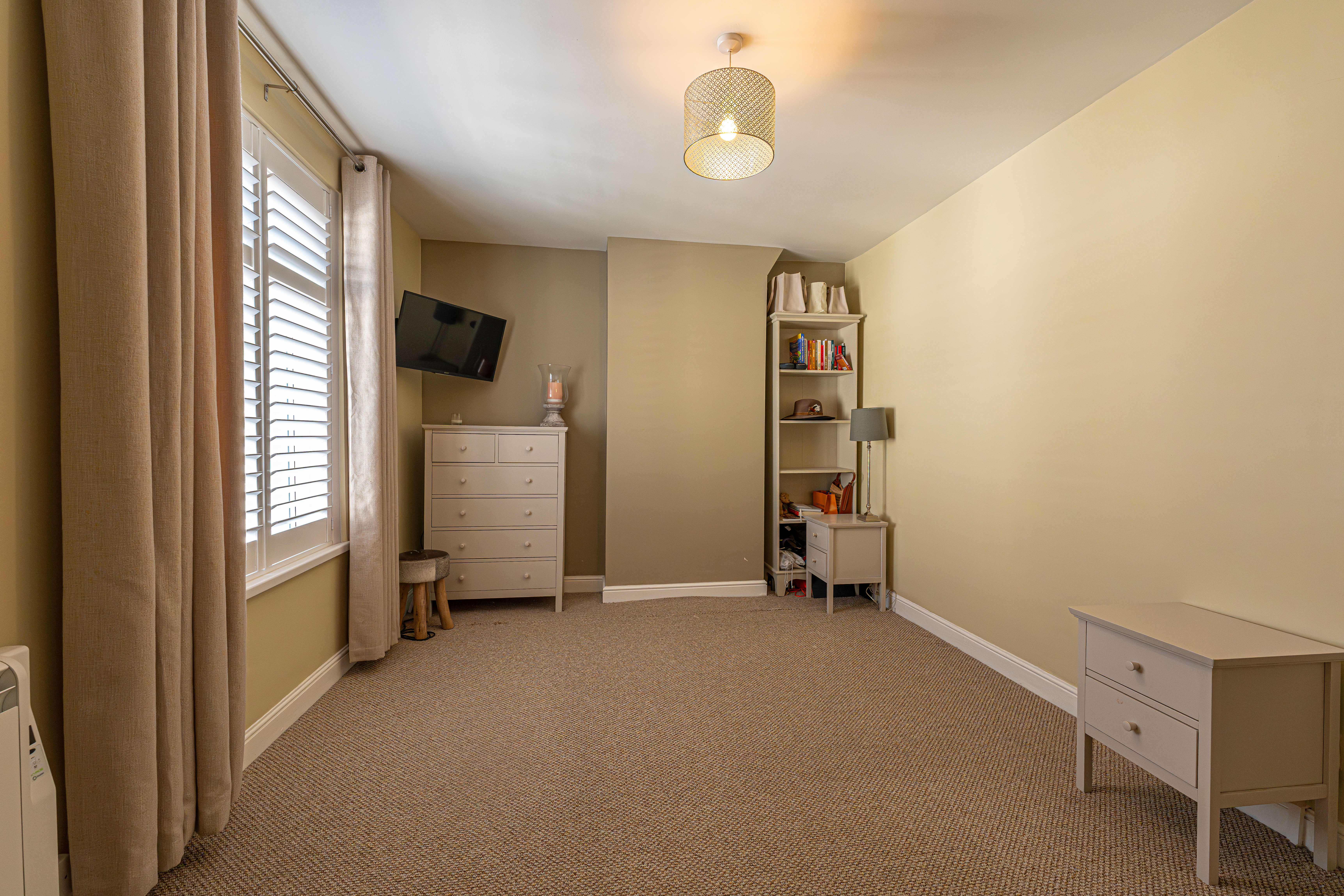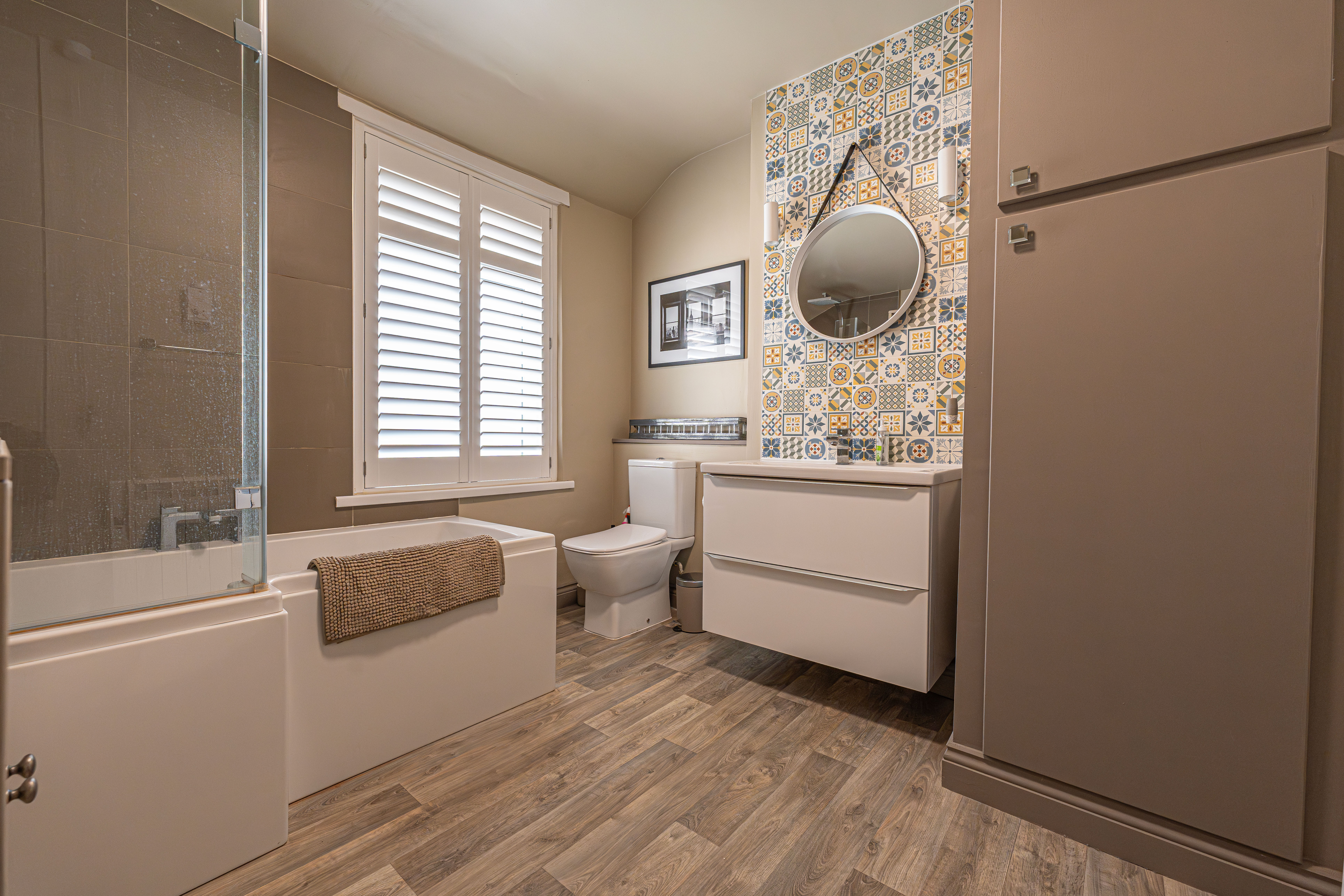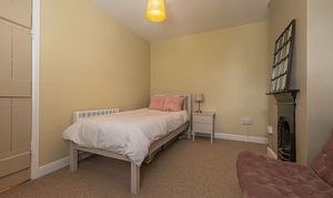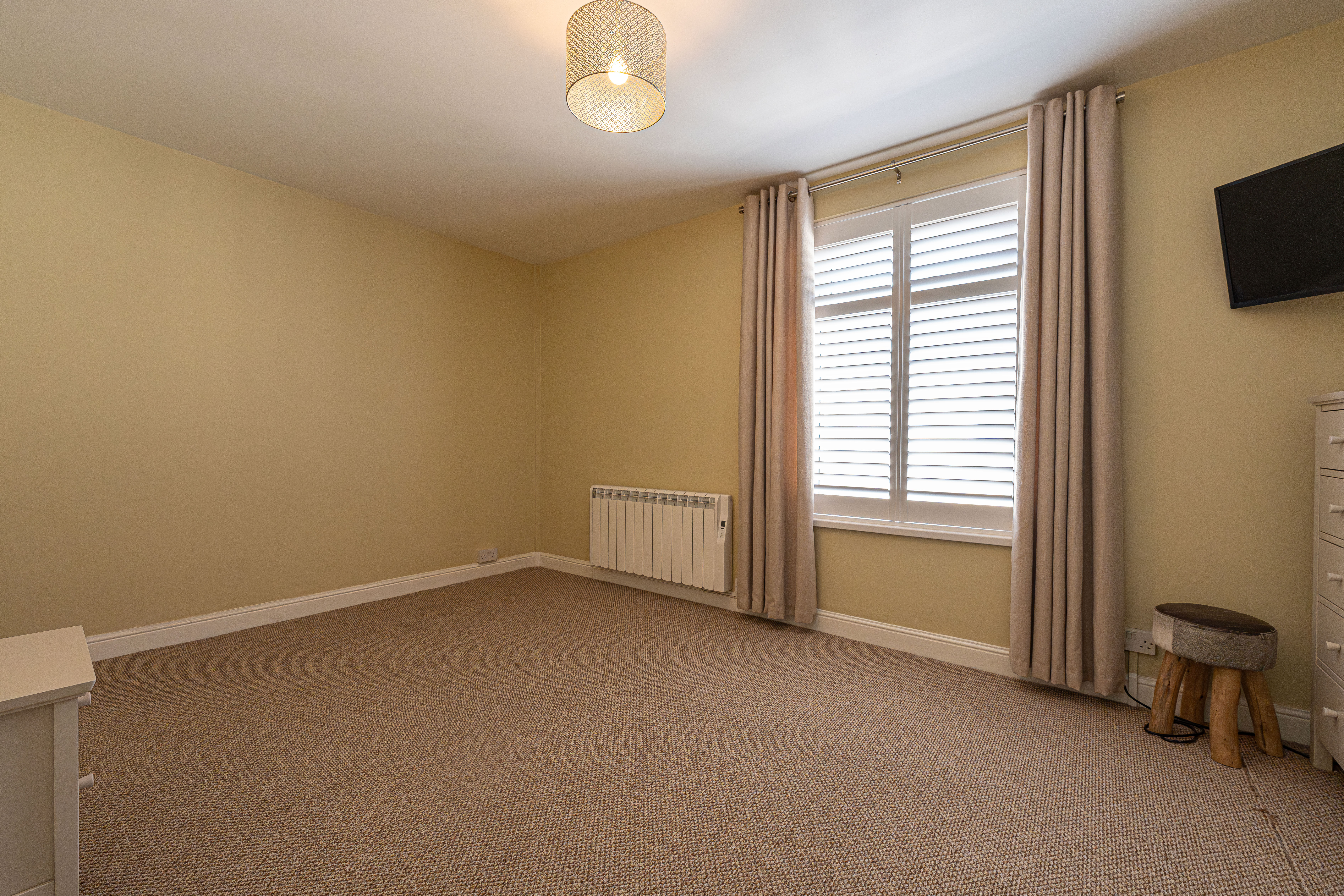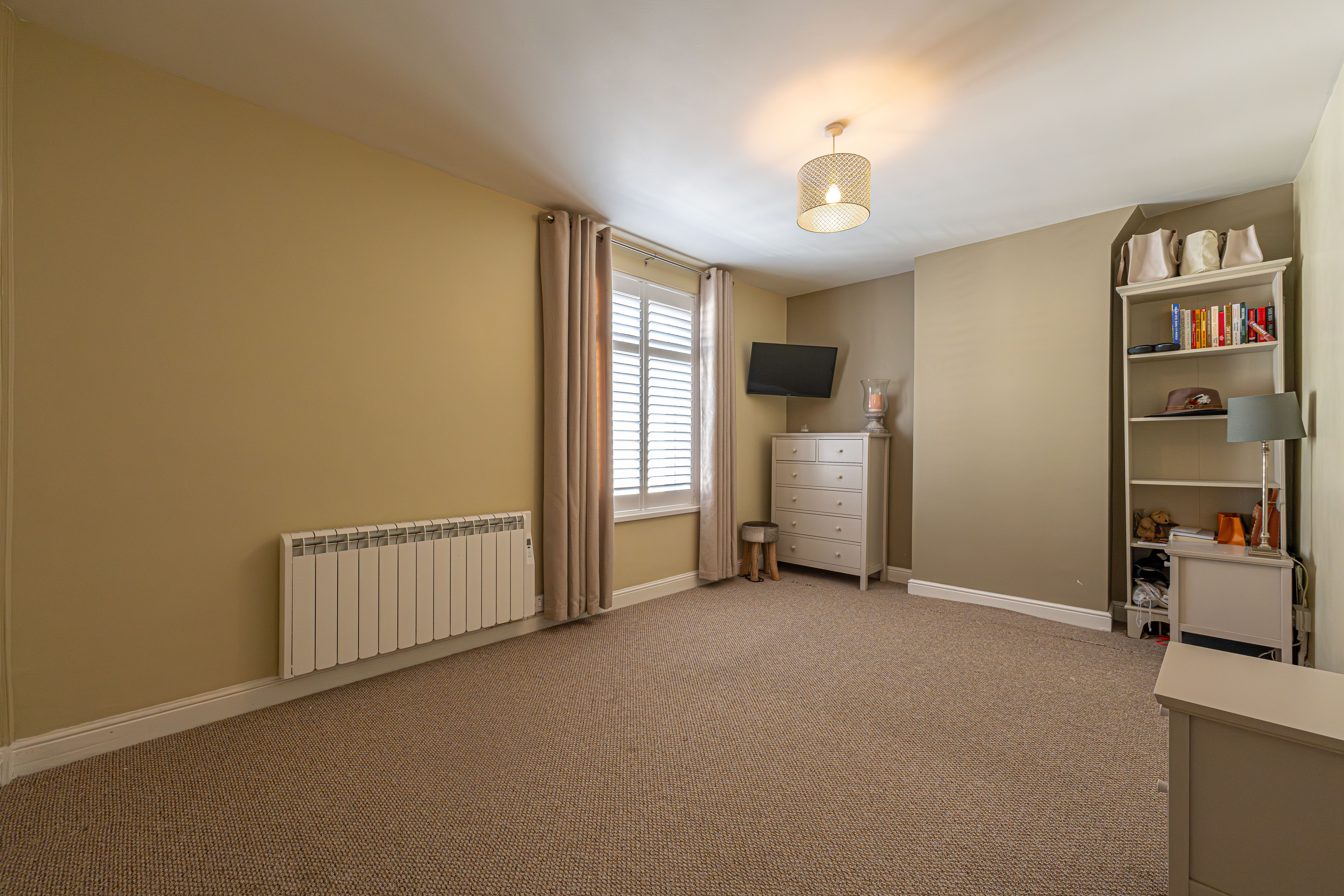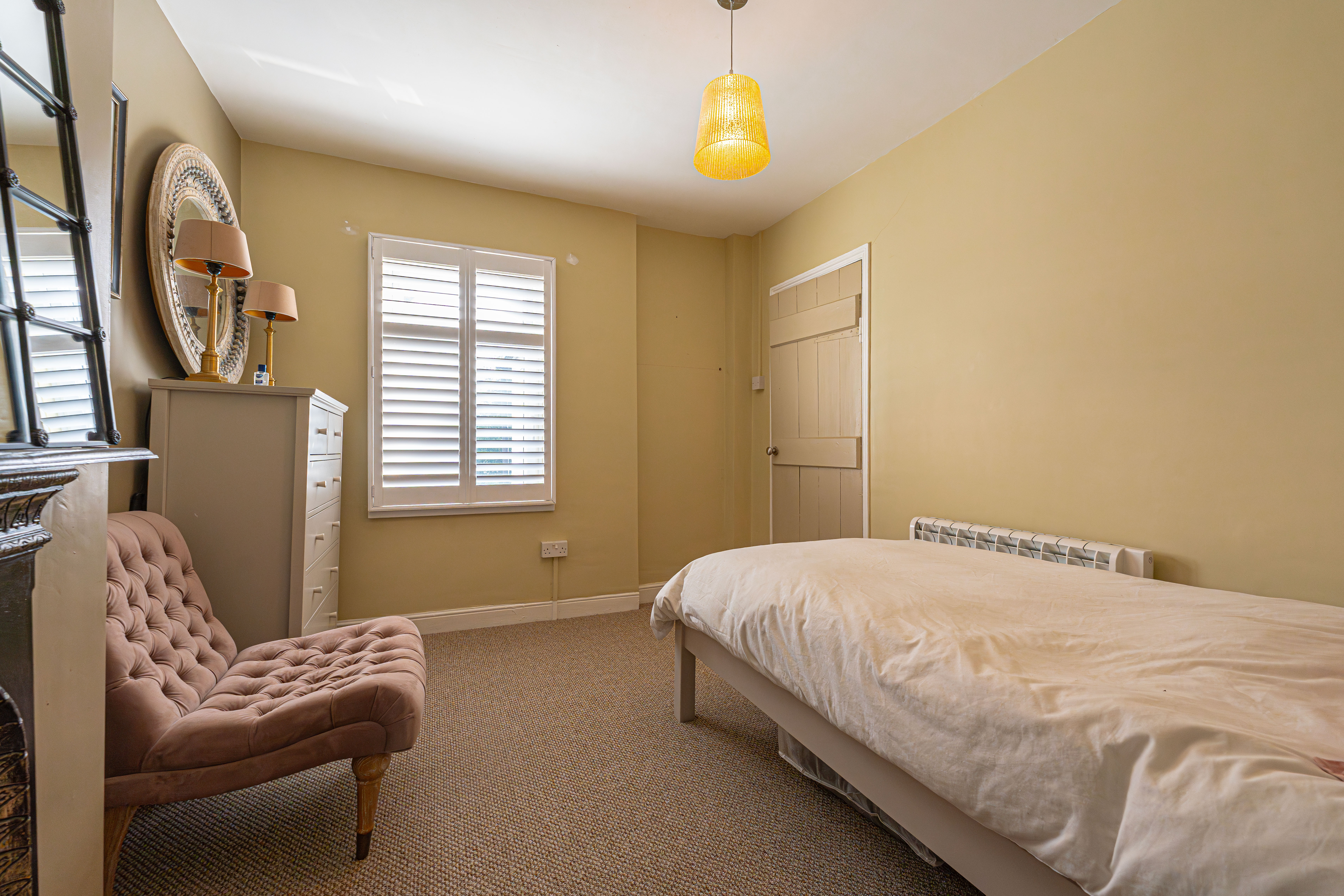 Ascending to the first floor we have two bedrooms that are both generous double rooms, each fitted with stylish shutters, while the second bedroom features another period fireplace. The spacious family bathroom is equipped with a bath suite and overhead shower, as well as a large sink and fitted airing cupboard.