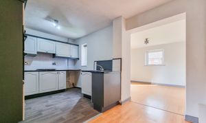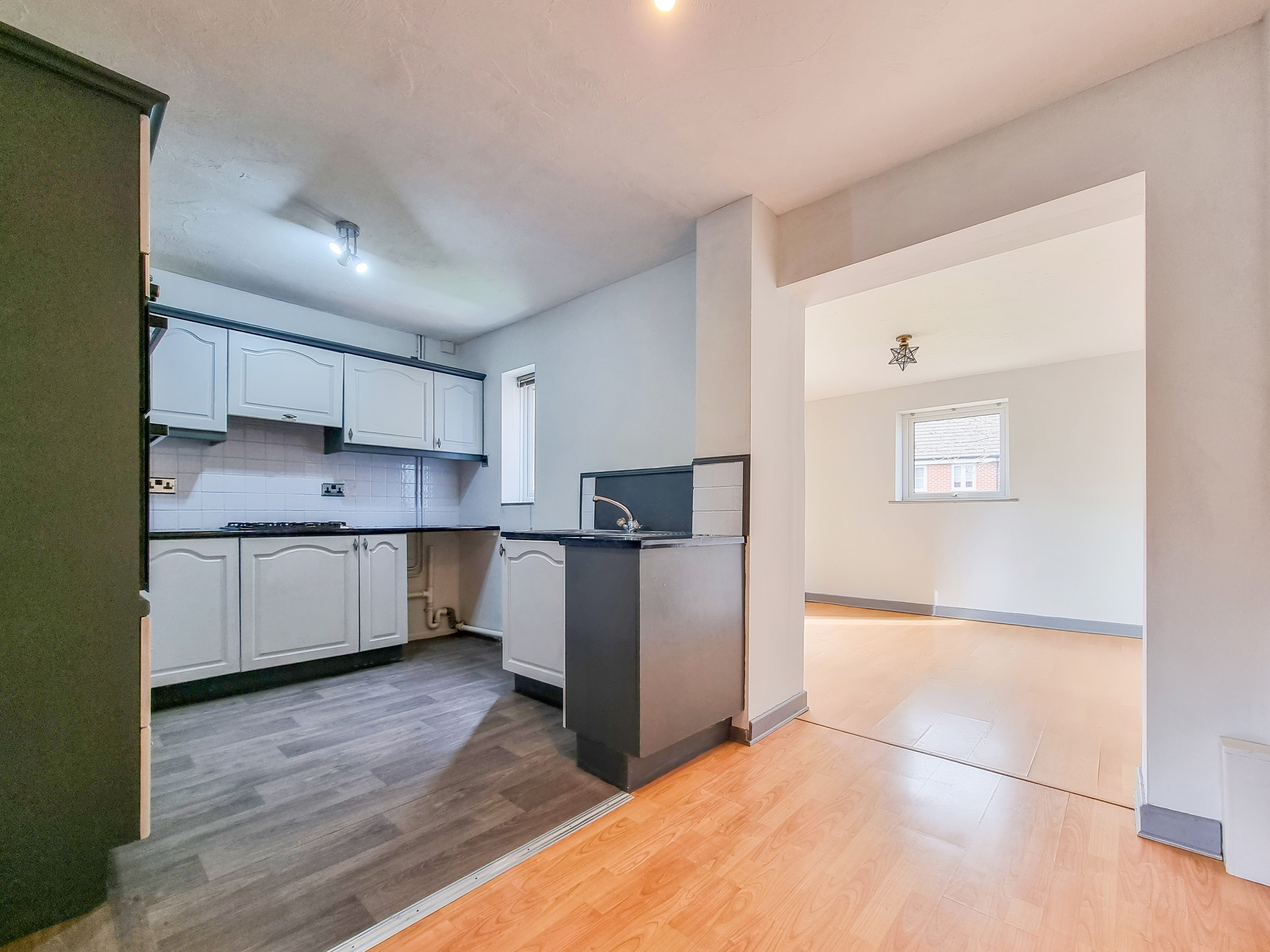 Having wood effect flooring, with a range of white kitchen units seated beneath a contrasting work surface. There is space with plumbing for a washing machine, a four-ring gas burning hob, a stainless-steel electric double oven, and a stainless steel sink with drainer. There is also a UPVC double glazed window and a central heating radiator. Open plan access to the family room.