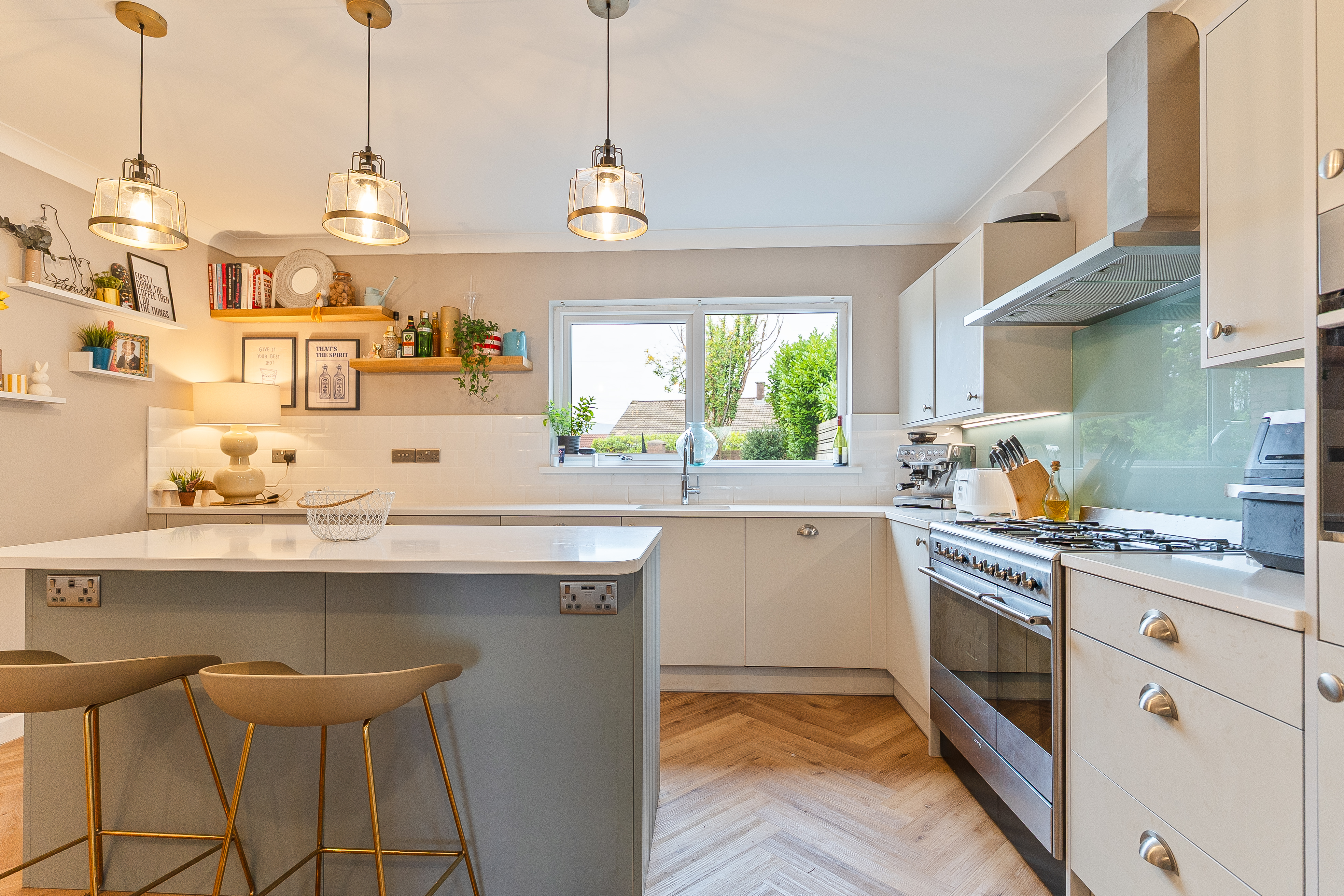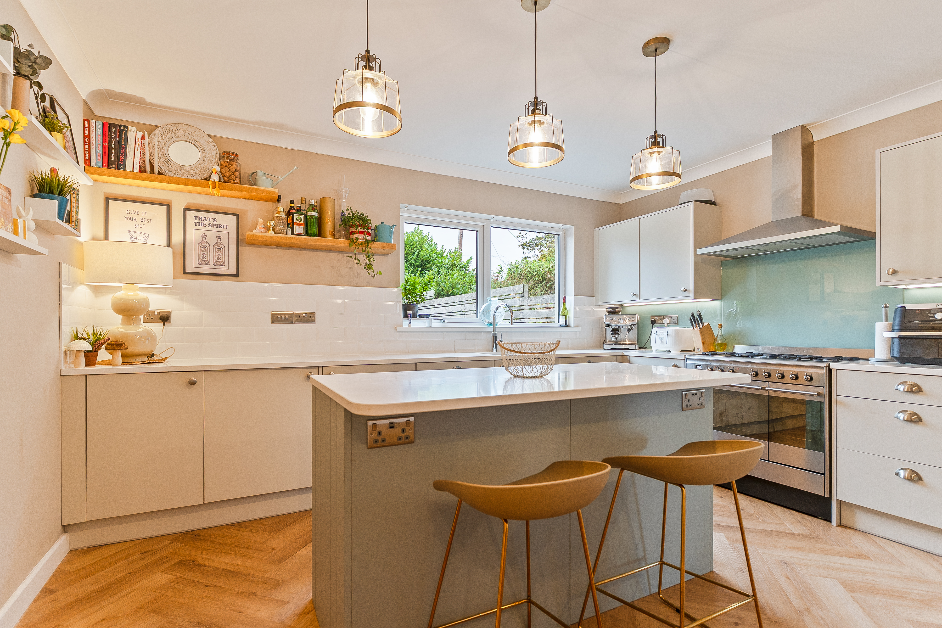On the ground floor, you enter through an initial porch leading into a welcoming main hallway, which provides access to all principal living areas, the staircase to the first floor, and a cloakroom complete with WC and hand basin. To the front of the property is the modern, high-specification kitchen, designed with both style and functionality in mind. This impressive space features a large central island with a breakfast bar, a range of integrated appliances, and space for additional freestanding appliances. The kitchen’s sleek finish and generous proportions make it a perfect area for both everyday use and entertaining.