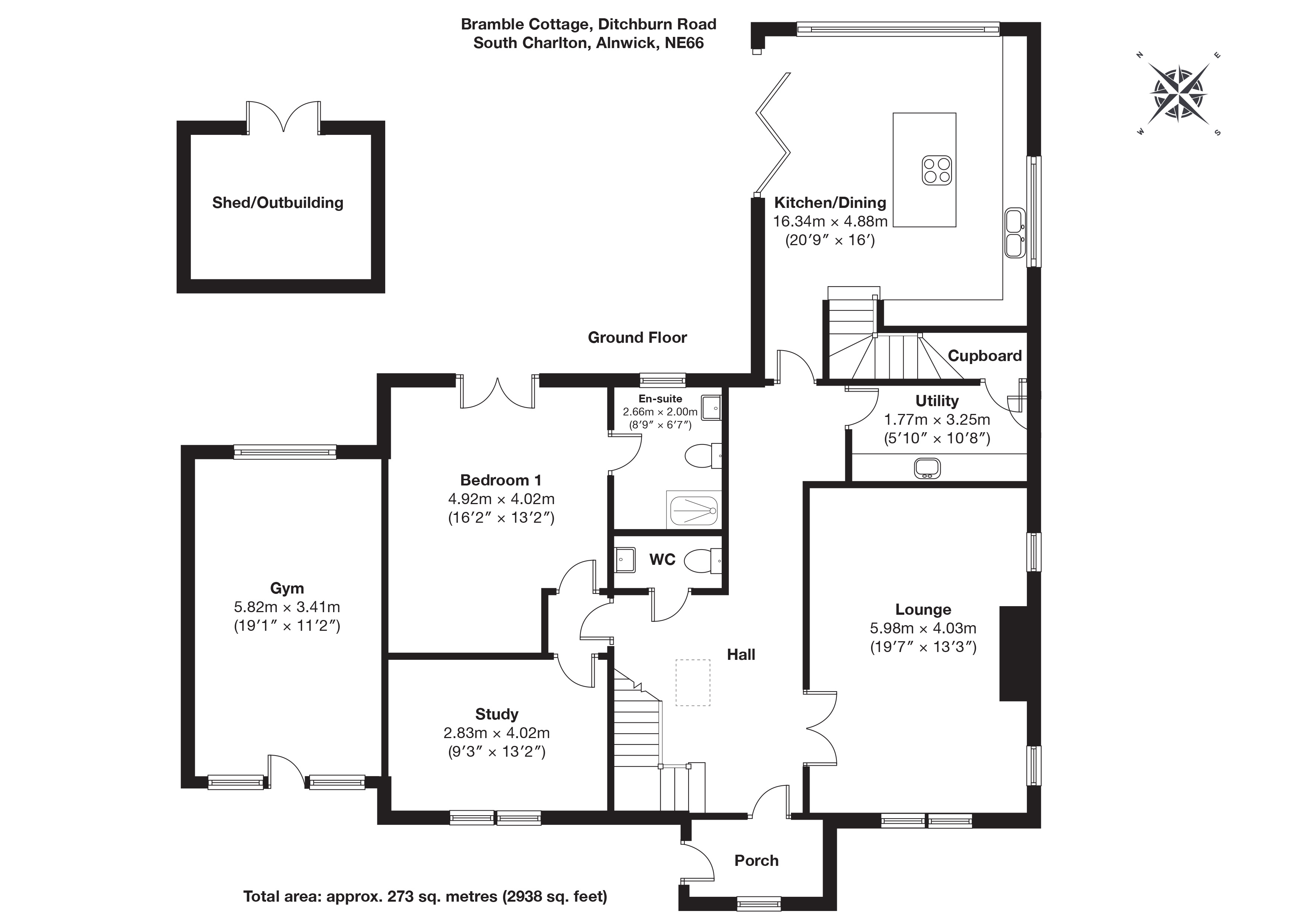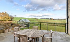 Bramble Cottage sits behind a broad gravelled driveway that offers comfortable parking for multiple vehicles. The dressed stone elevations and slate roof reflect traditional Northumbrian architecture while presenting a crisp, modern finish. At the rear, a raised stone terrace with glazed balustrade provides an attractive space for outdoor dining with uninterrupted views across open countryside. Steps lead down to a well kept lawn bordered by timber fencing. To one side of the garden sits a substantial timber outbuilding, ideal for storage or hobbies, and a greenhouse is positioned to capture the best of the light. The overall setting is peaceful and open, with a continual sense of space and rural outlook.