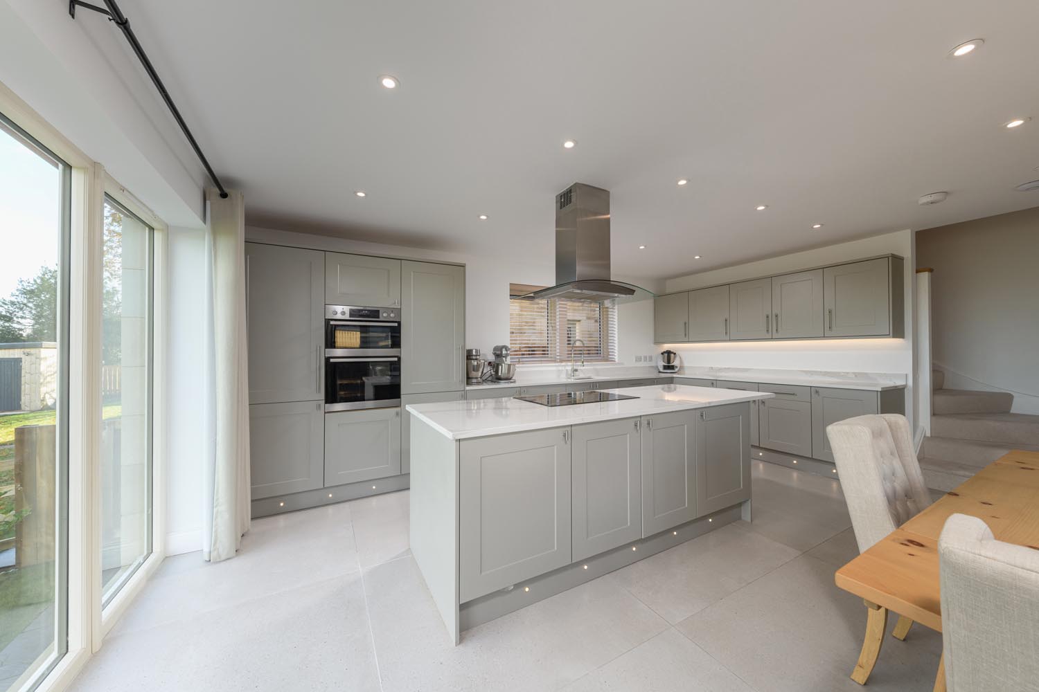 The kitchen and dining room sit at the rear of the house and extend to an impressive length, arranged to draw in the wide open views across surrounding fields. Shaker style cabinetry in a muted palette is paired with quartz work surfaces and a large central island, creating a well planned workspace for cooking and entertaining. Integrated appliances, beneath cabinet lighting and a bank of full height units enhance the clean design. Sliding doors open to the terrace, allowing the room to connect directly with the garden. The adjoining utility room mirrors the kitchen’s quality and includes extensive storage, work surfaces and external access.