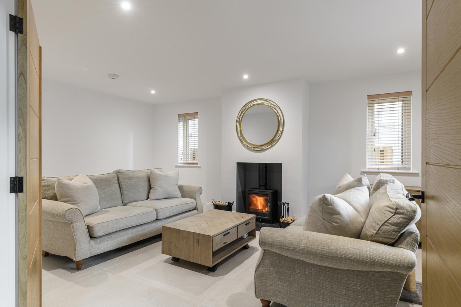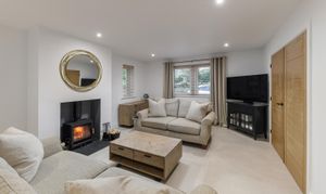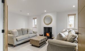 The sitting room is an inviting space centred around a wood burning stove, with dual aspect windows that bring a gentle softness to the room. Across the hall, a study provides a peaceful setting for work, reading or quiet routines.